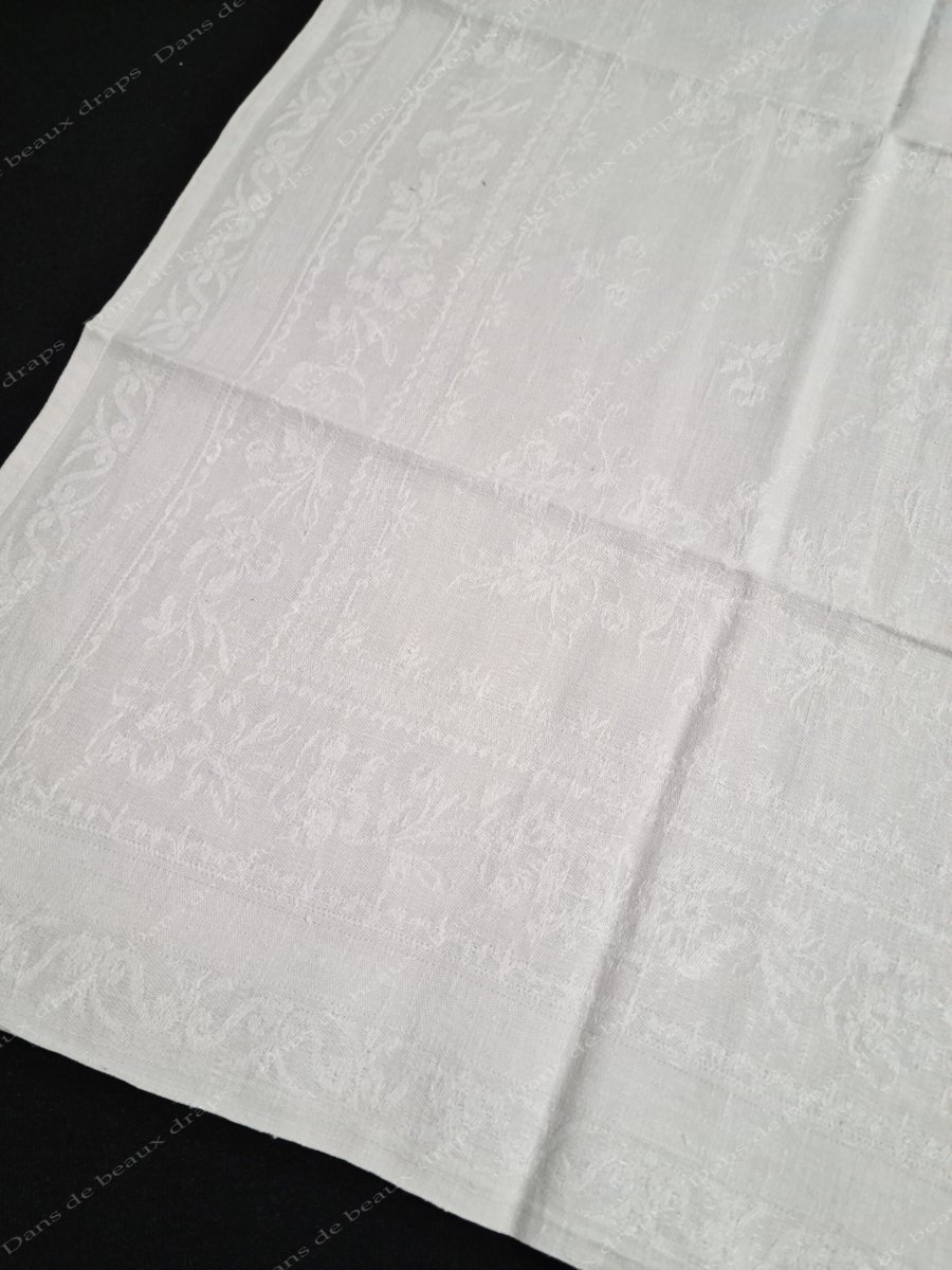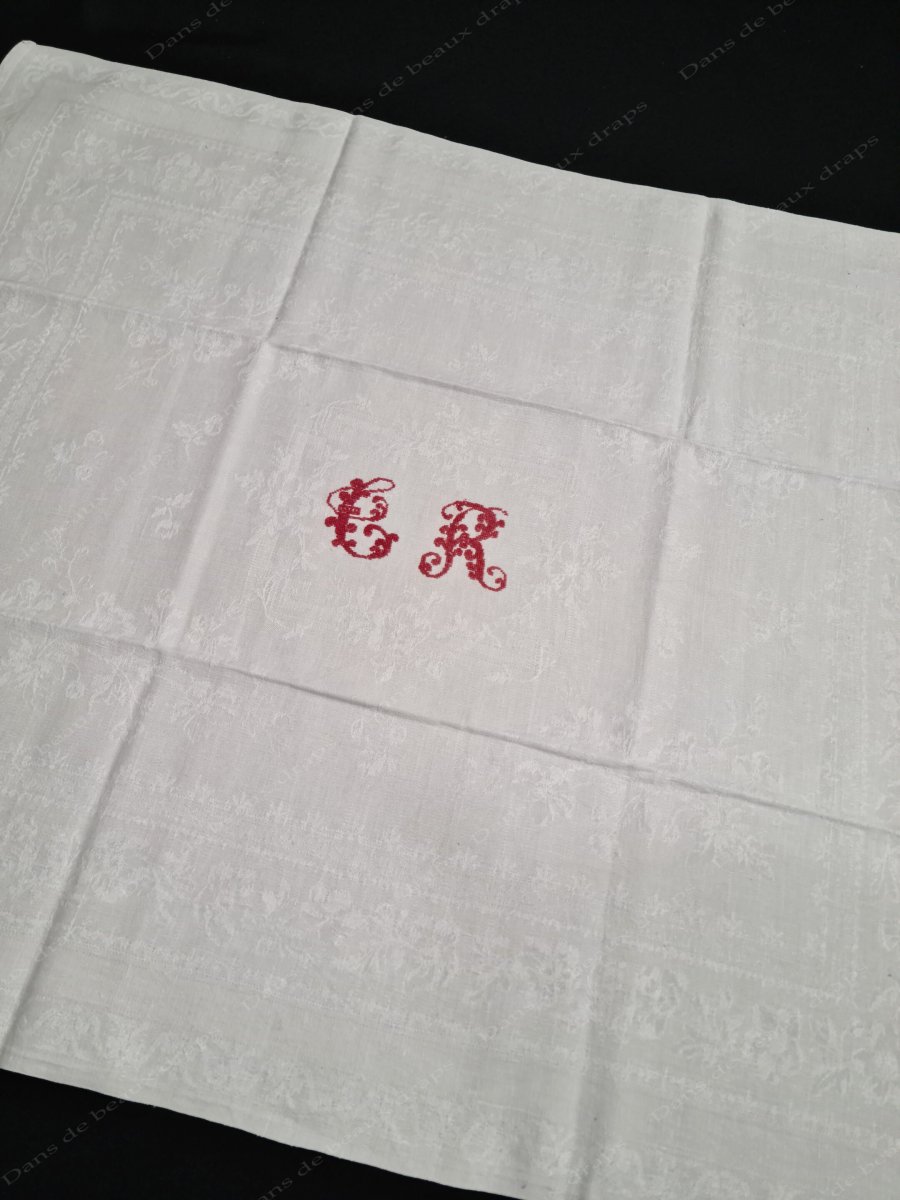 Au centre, dans un rectangle,entouré de fleurs,un monogramme TR ,brodé main au point de croix rouge en relief.