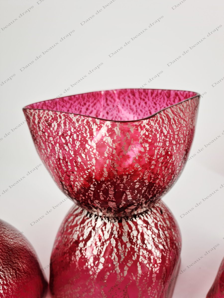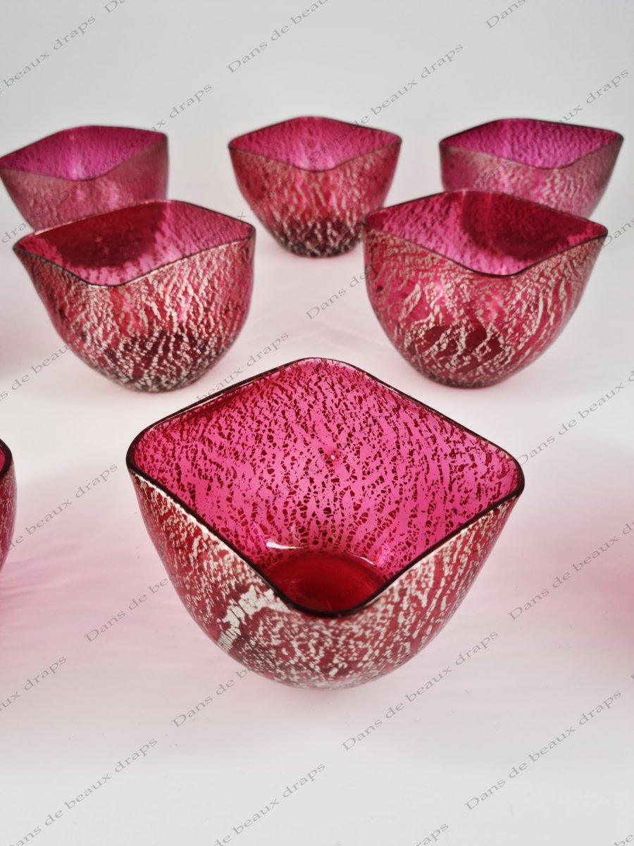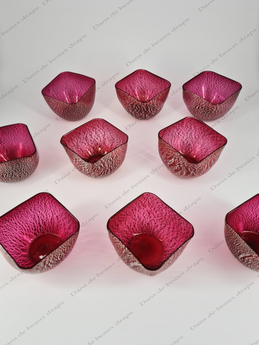9 belles coupes à dessert en cristal rose vif,peignées argent.