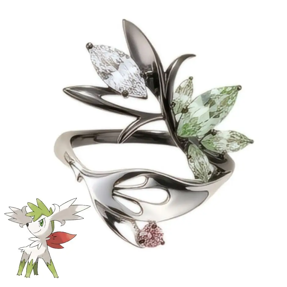 Cette magnifique bague est inspirée du Pokémon légendaire Shaymin. Son design élégant combine des formes florales et des pierres décoratives qui rappellent la nature et l’énergie du célèbre Pokémon.