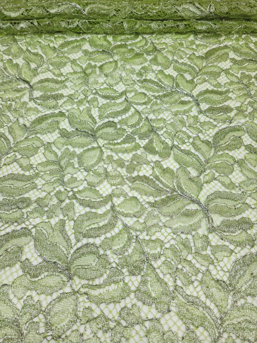 Dentelle de Calais Caudry vert Anis rebrodée d’un fil argent , motif floral dense ,