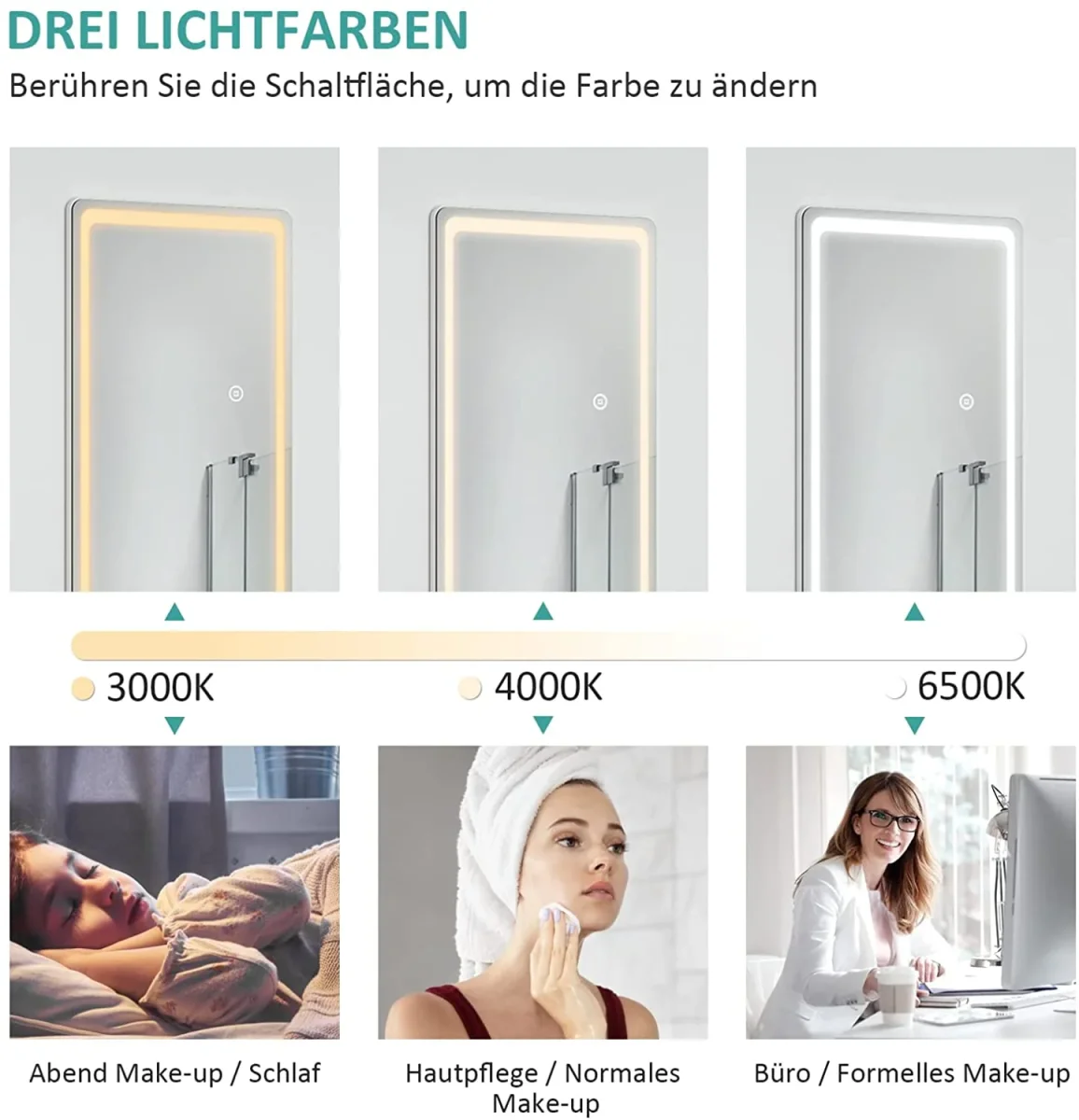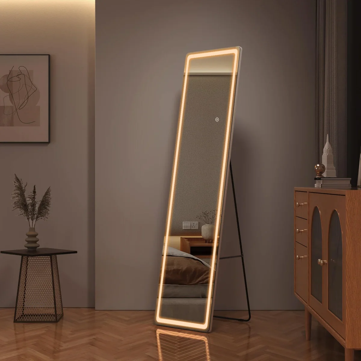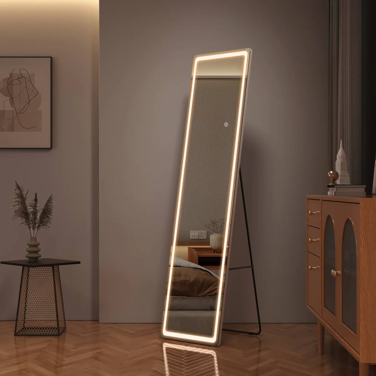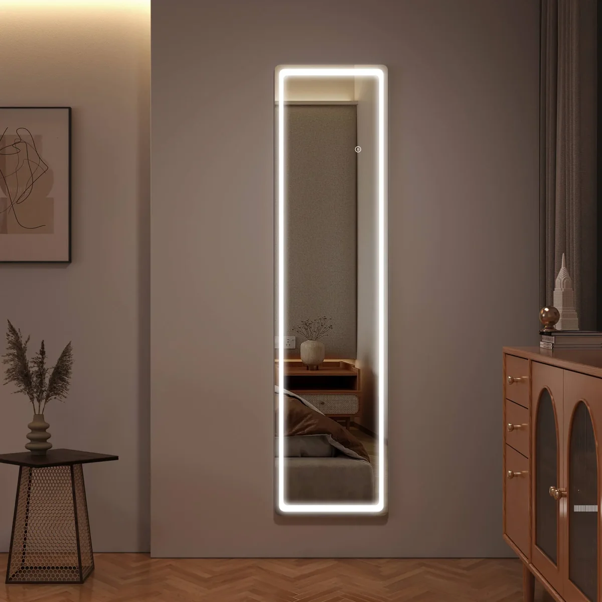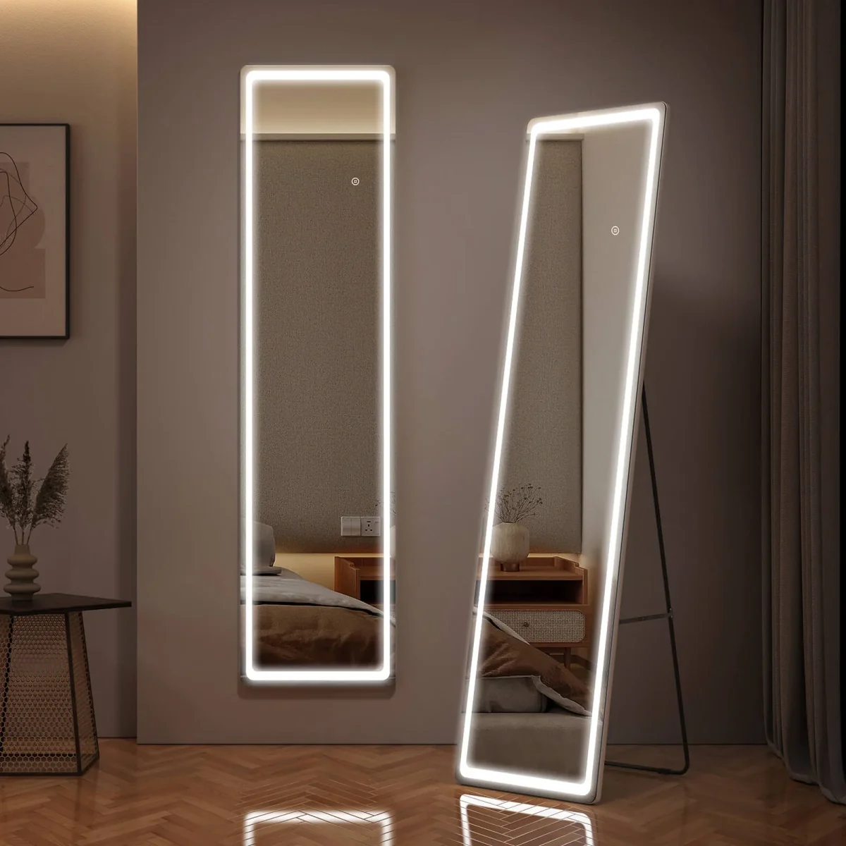 • Intensités lumineuses réglables : Ce miroir pleine longueur (dimensions : 1600x400x20 mm) possède une bande lumineuse intégrée qui fait le tour du miroir. Vous pouvez utiliser l’interrupteur tactile intégré pour choisir entre trois couleurs de lumière : blanc froid, blanc neutre et blanc chaud. L’interrupteur tactile brille d’un blanc laiteux lorsqu’il est allumé et d’un bleu subtil lorsqu’il est éteint.