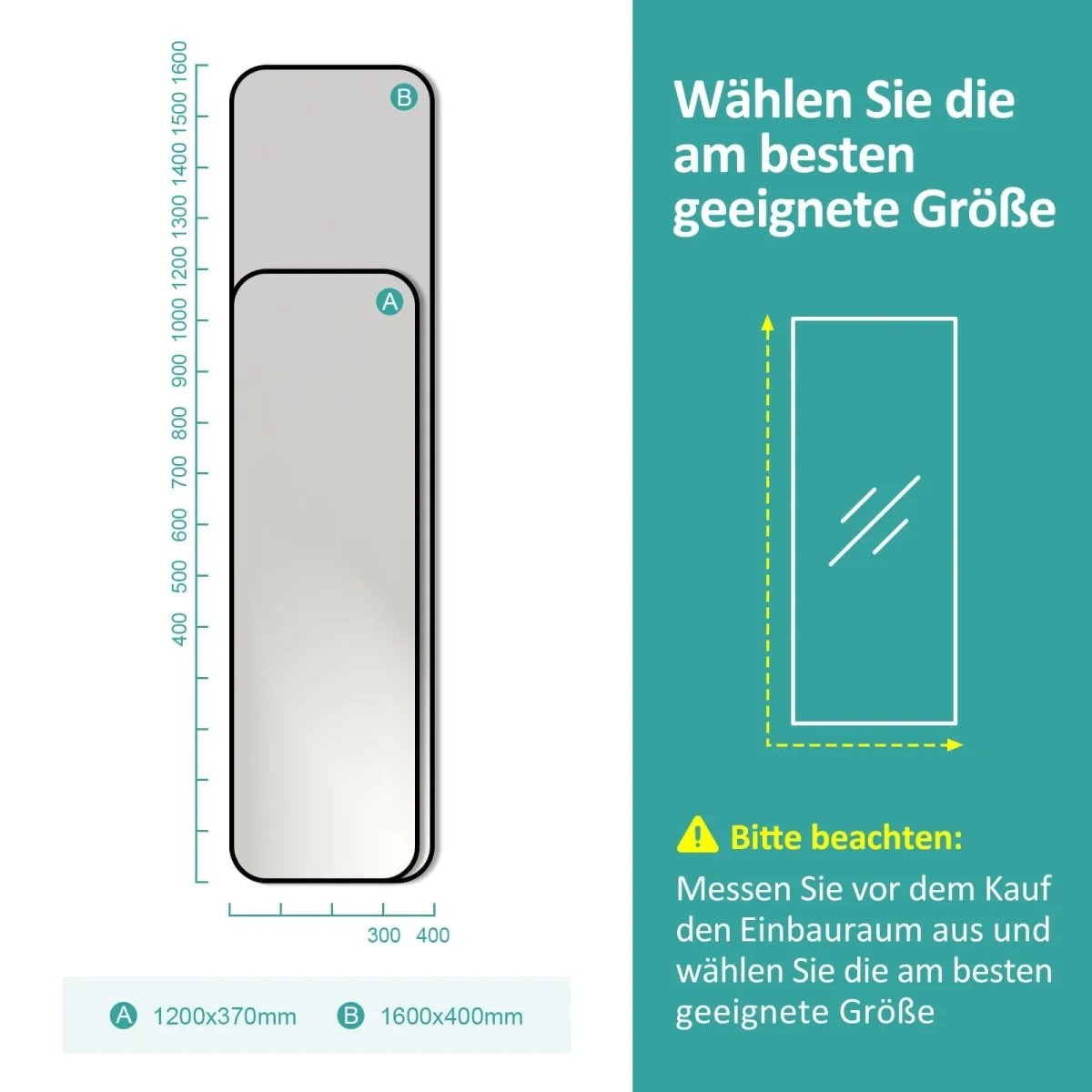 - Dimensions / Versions : Cet élégant miroir pleine longueur est disponible en 2 dimensions différentes (120x37cm et 160x40cm). Les deux versions conviennent aussi bien pour un montage mural que pour un placement libre dans le pièce (le support dépliable est intégré à l’arrière). La version plus petite est idéale pour le montage sur les portes, les murs d’une chambre ou d’un vestiaire. La grande version convient non seulement à un usage privé, mais également à une installation dans des salons de coiffure, des salles de fitness ou des centres commerciaux.