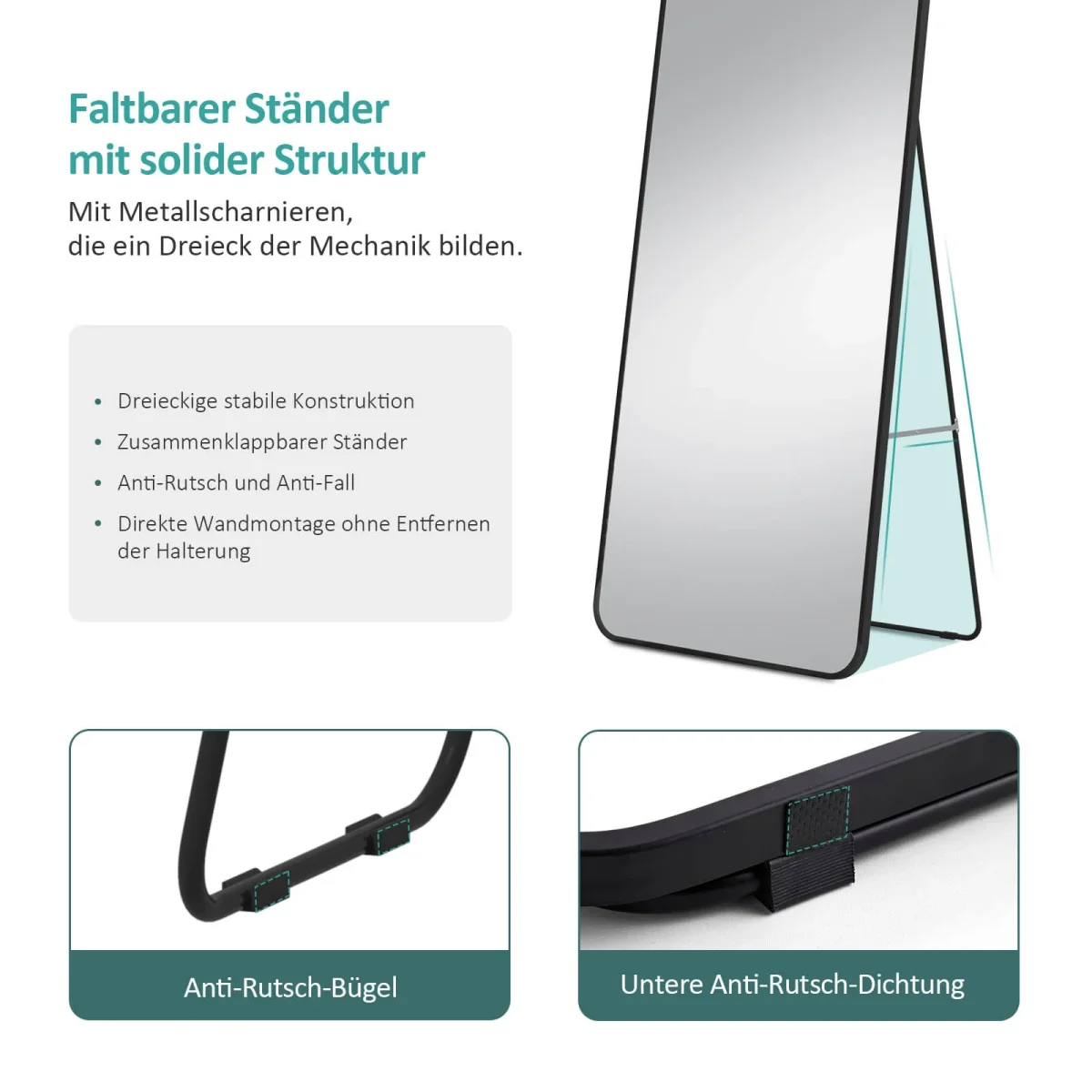 - Structure triangulaire stable : Le support pliable et le bas du miroir sont équipés de patins antidérapants qui assurent un maintien sr au sol.< /li>