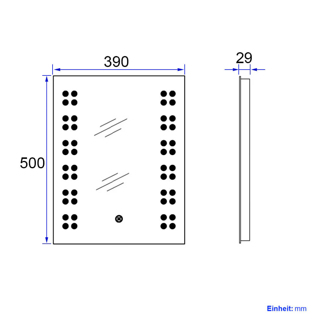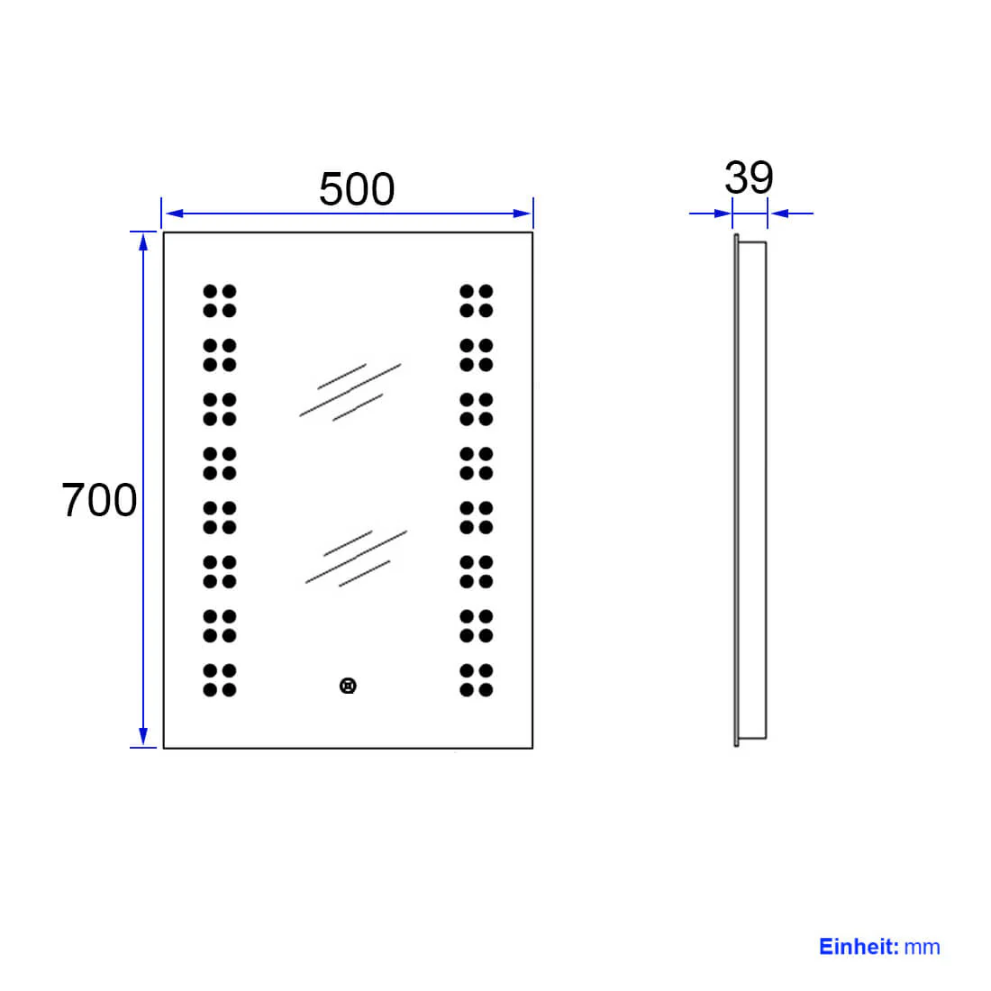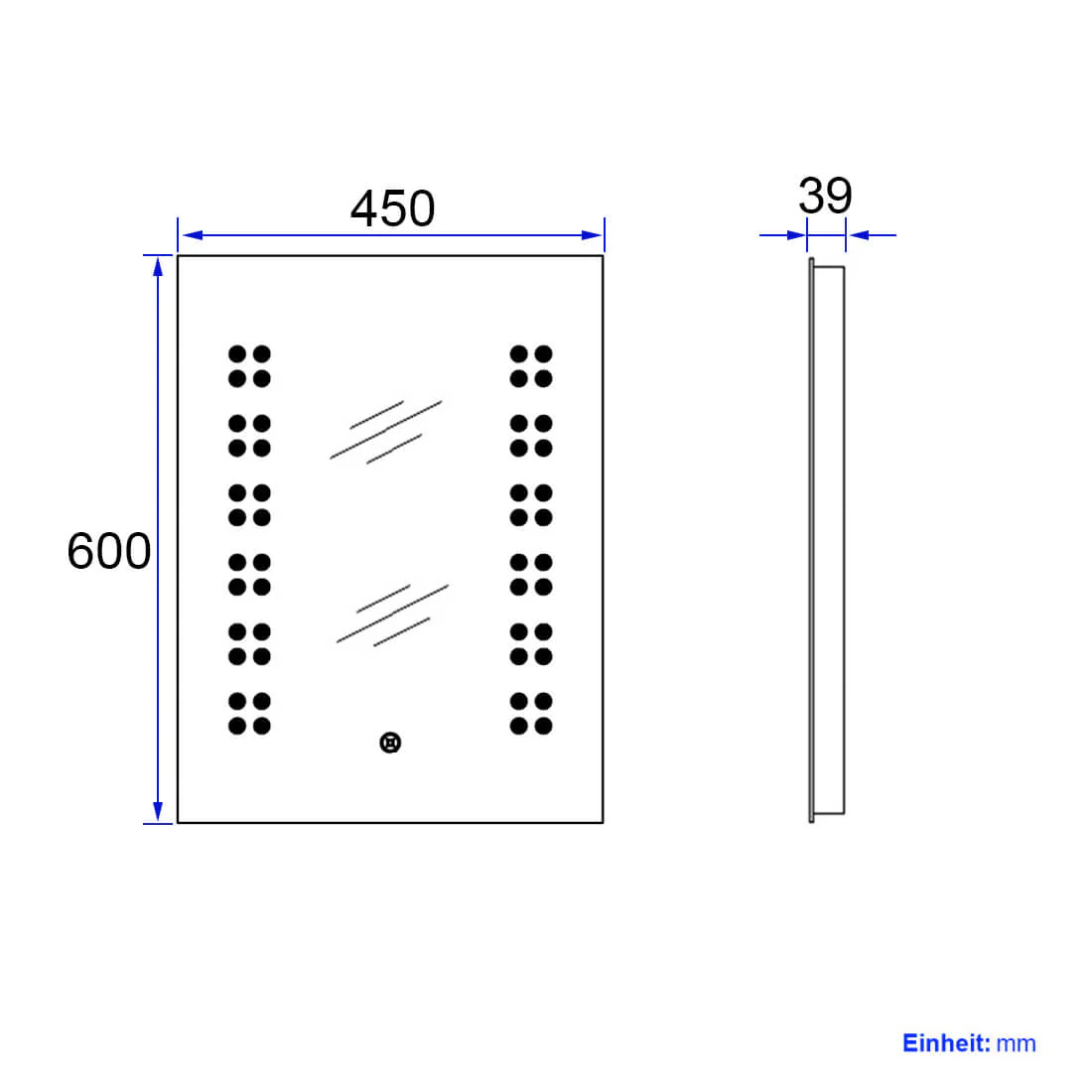 - Design : Ce miroir mural moderne sans rebord est doté d’un éclairage LED intégré. Les LED particulièrement économes en énergie ont une durée de vie d’environ 50 000 heures et brillent à travers la surface du miroir sur les côtés gauche et droit grâce à des points mats. L’éclairage (6500K) peut être activé à l’aide d’un interrupteur tactile discrètement intégré dans la surface du miroir. Les bords sont aplatis. Le miroir n’a que 3,9 cm de profondeur, ce qui lui permet de s’adapter élégamment au mur.