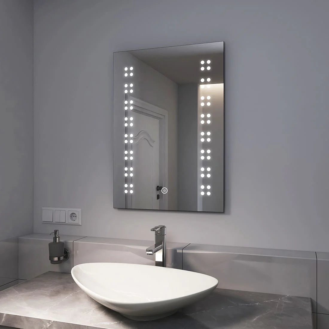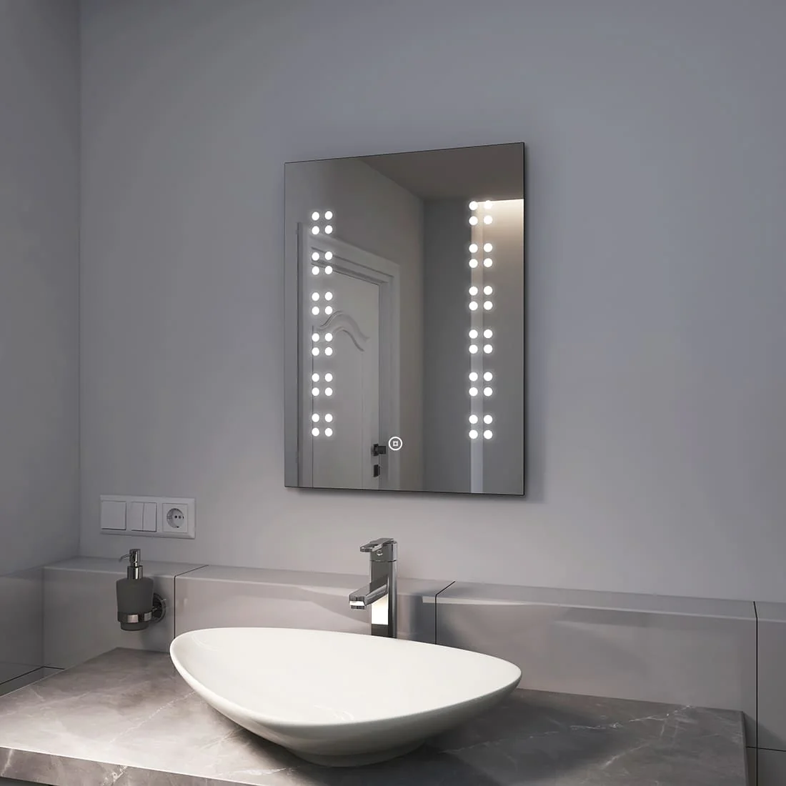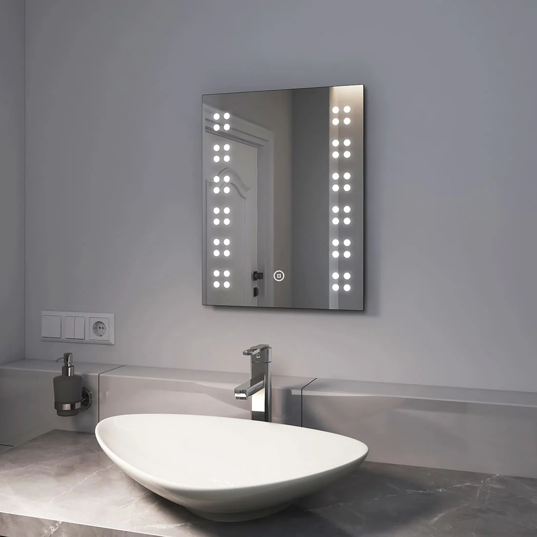 - Design : Ce miroir mural moderne sans rebord est doté d’un éclairage LED intégré. Les LED particulièrement économes en énergie ont une durée de vie d’environ 50 000 heures et brillent à travers la surface du miroir sur les côtés gauche et droit grâce à des points mats. L’éclairage (6500K) peut être activé à l’aide d’un interrupteur tactile discrètement intégré dans la surface du miroir. Les bords sont aplatis. Le miroir n’a que 3,9 cm de profondeur, ce qui lui permet de s’adapter élégamment au mur.