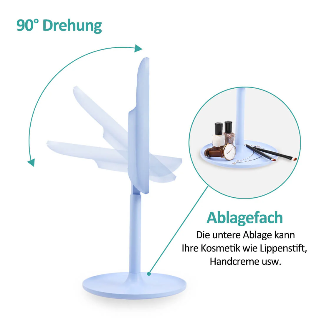 - Lumière variable : Ce miroir cosmétique (simple reflet) avec support est rabattable et dispose d’un éclairage LED intégré. L’éclairage peut être réglé sur trois niveaux de luminosité grace à deux interrupteurs intégrés en faade : blanc froid, blanc neutre et blanc chaud. Chacune des trois couleurs de lumière peut également être atténuée.