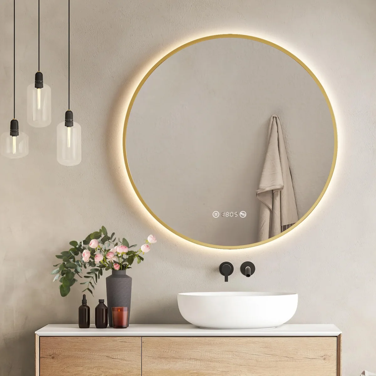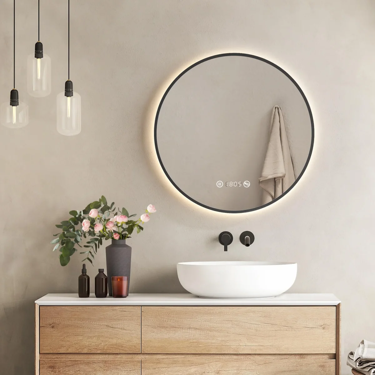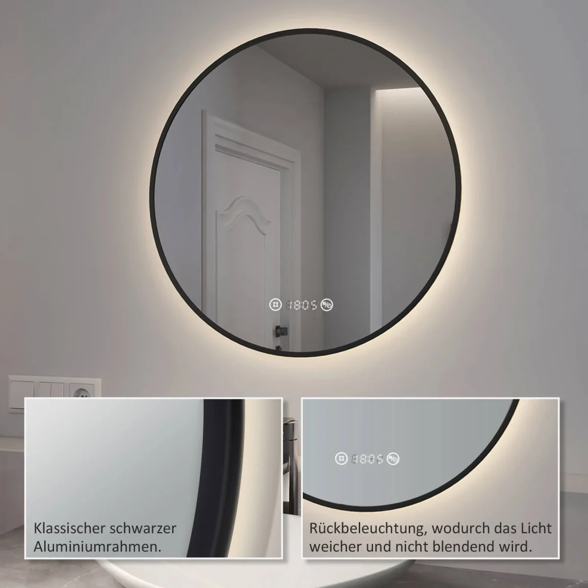 - Design élégant : La profondeur de ce magnifique miroir rond, doté d’une bordure noire ou dorée, n’est que de 3 cm, ce qui signifie qu’il s’adapte élégamment à n’importe quel mur. Derrière le miroir se trouvent des LED de haute qualité qui, sur simple pression d’un bouton, diffusent une lumière naturellement chaude de tous les côtés (4300 K). L’interrupteur pour l’éclairage LED est discrètement intégré dans la partie inférieure du miroir. Y compris la fonction de gradation et de mémoire. Disponible en 3 tailles différentes.