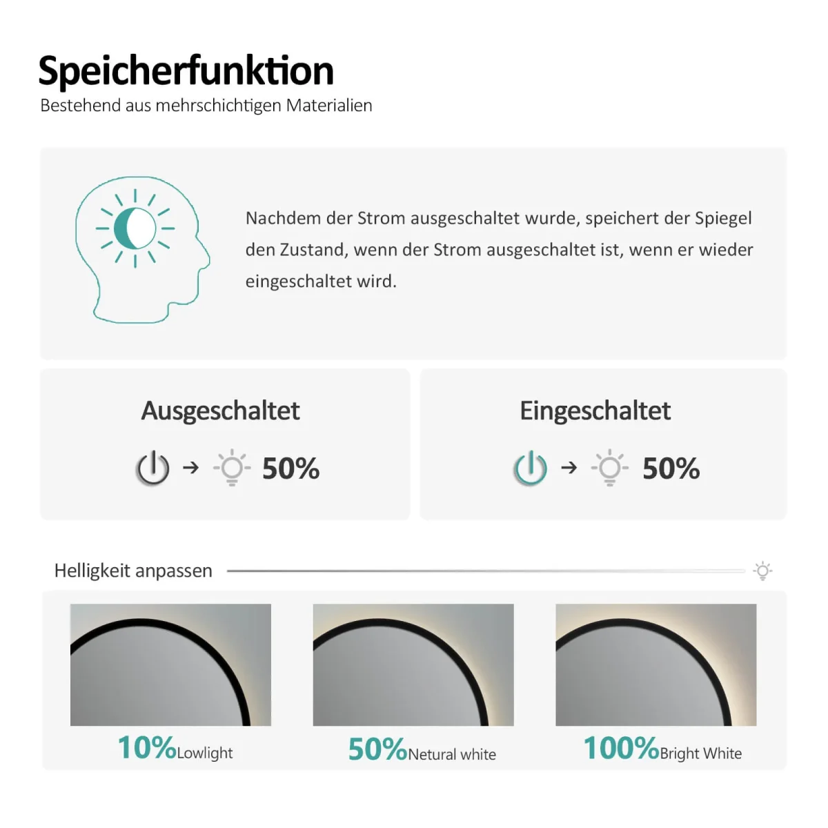 - Fonction antibuée intégrée : Surtout dans la salle de bain, il peut être gênant si un miroir s’embue (par exemple après une douche chaude). La fonction antibuée peut être d’un grand secours : sur simple pression d’un bouton, le rétroviseur est légèrement chauffé et le rétroviseur embué est à nouveau effacé. Le bouton de cette fonction est également discrètement intégré dans la partie inférieure du miroir, à côté de l’interrupteur d’éclairage.