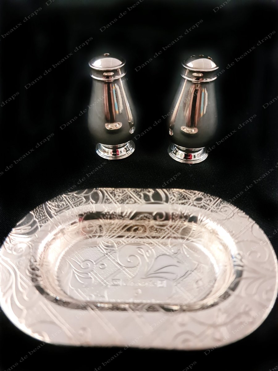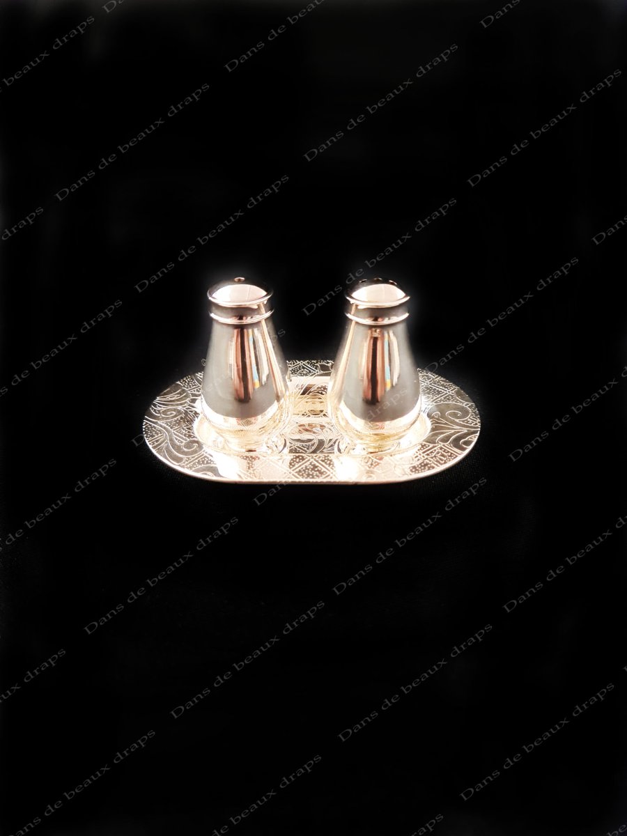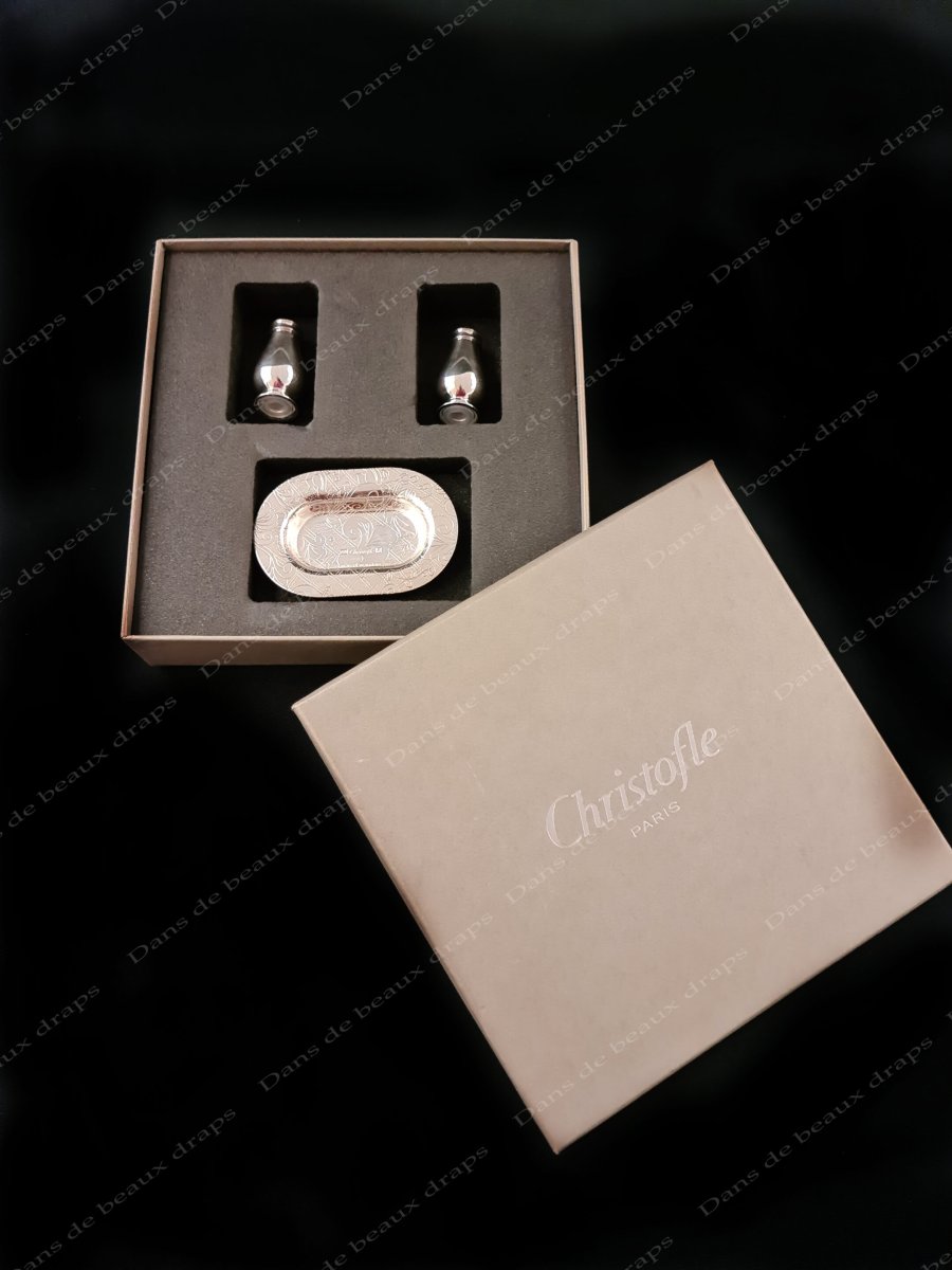 Ensemble salière et poivrier sur plateau en métal argenté,modèle Jardin d’Eden,Christofle,Paris.