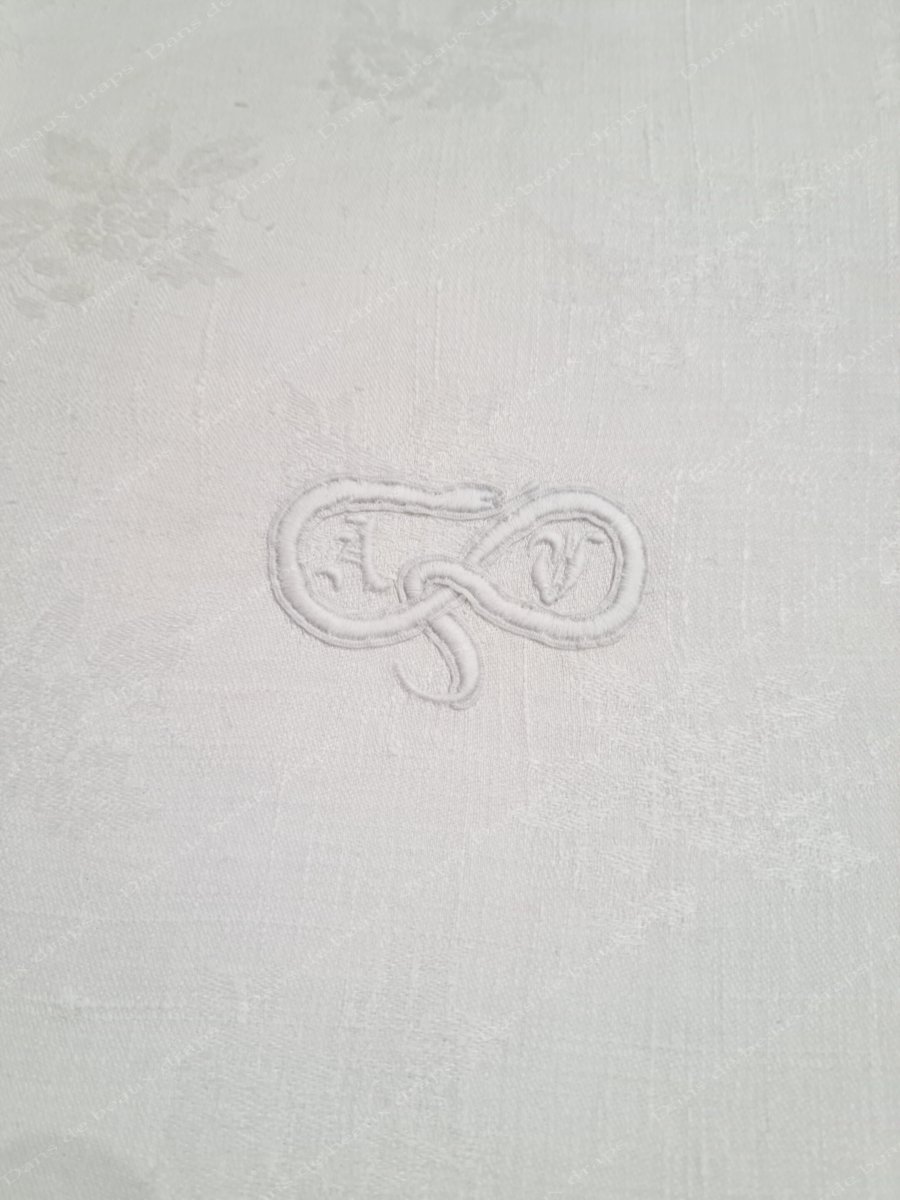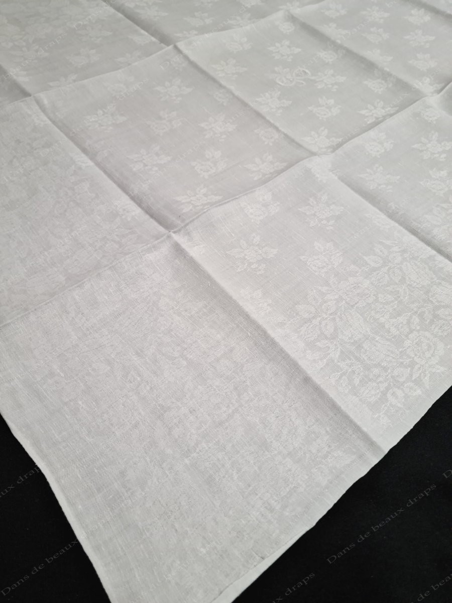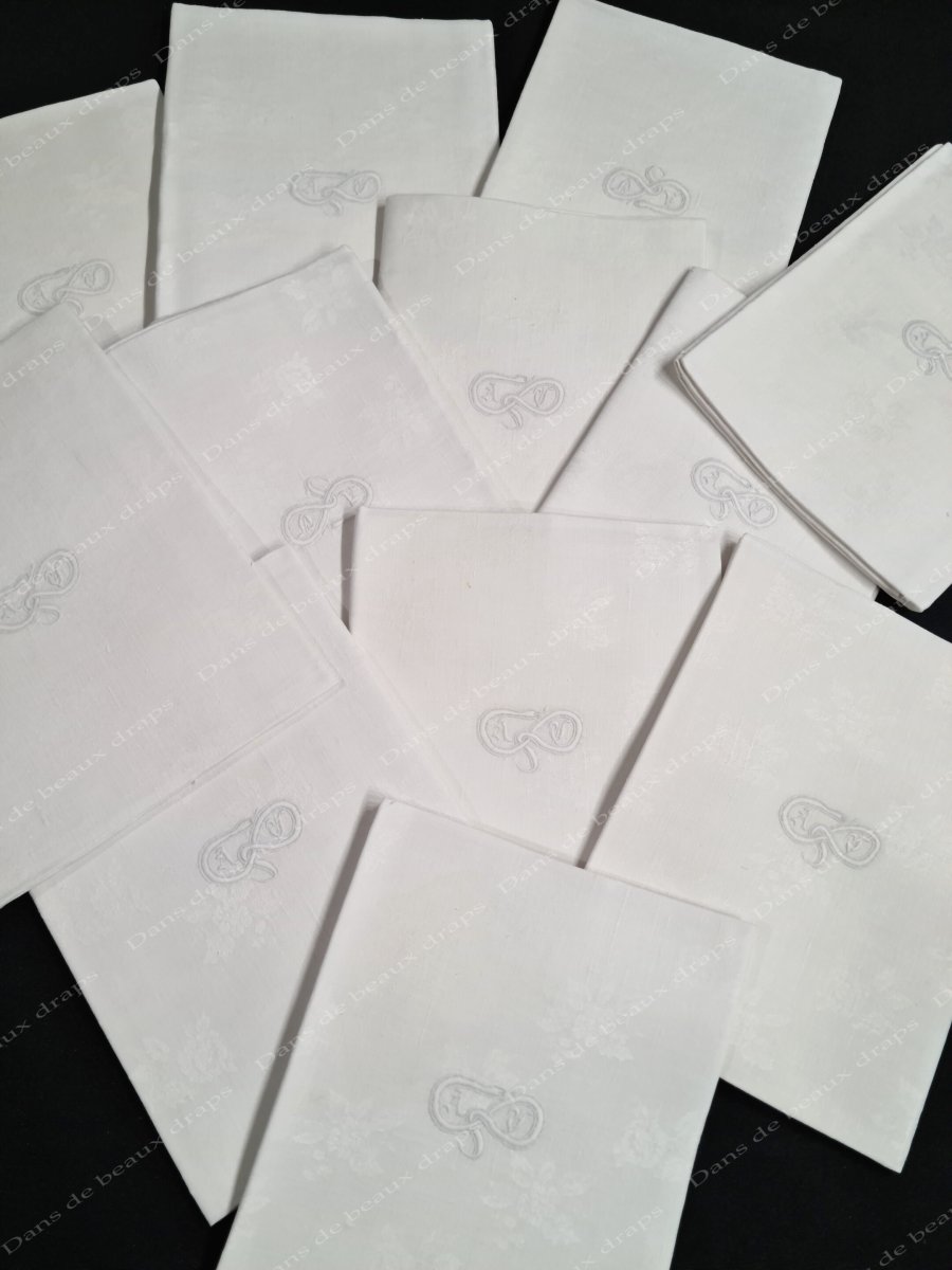 Étonnante suite de 12 serviettes de table en damassé de lin,monogramme AV entouré d’un serpent.