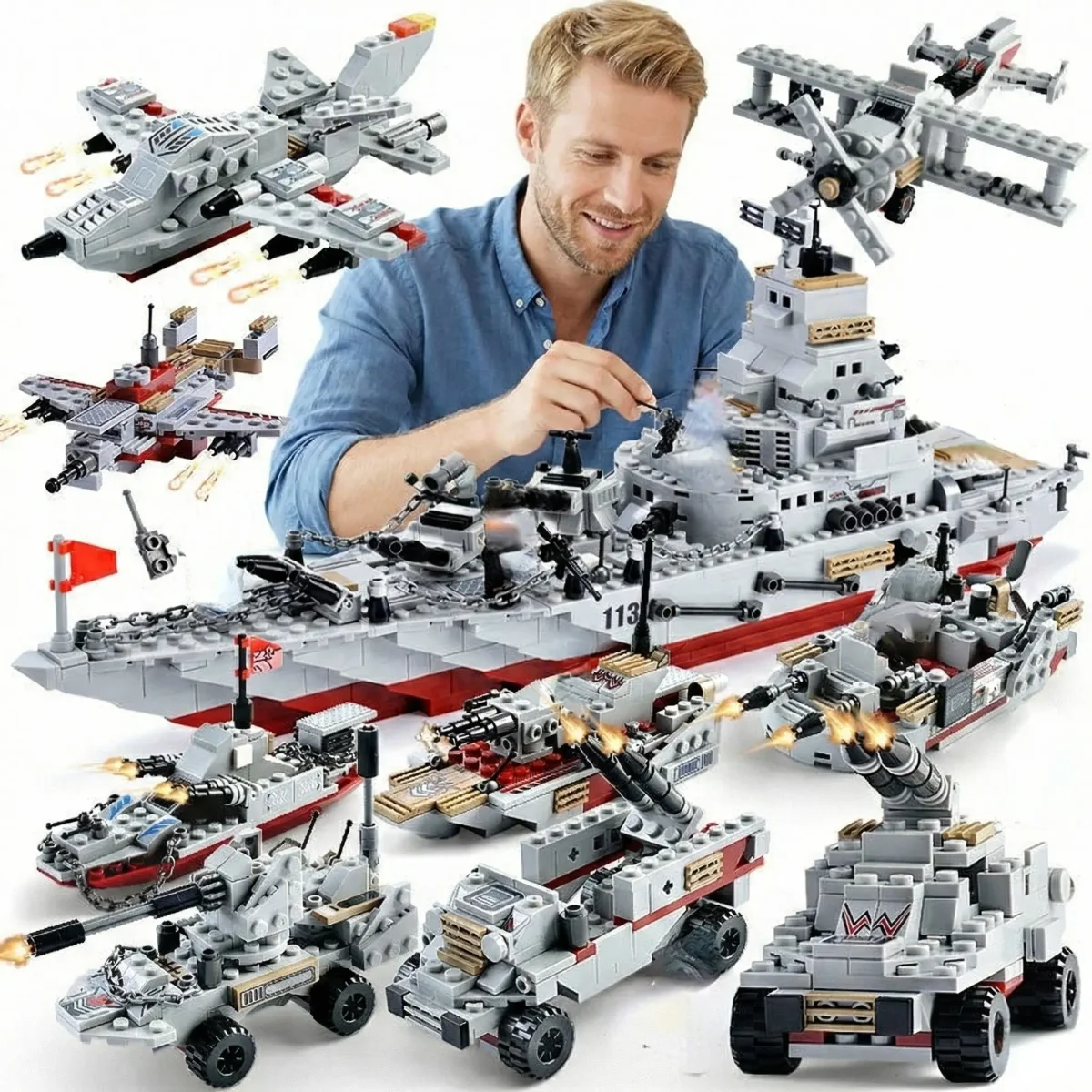 Le set inclut de nombreux éléments : armements, tourelles, véhicules blindés, avions et structures du navire. Chaque détail est conçu pour offrir un rendu visuel impressionnant, parfait pour le jeu comme pour l’exposition.