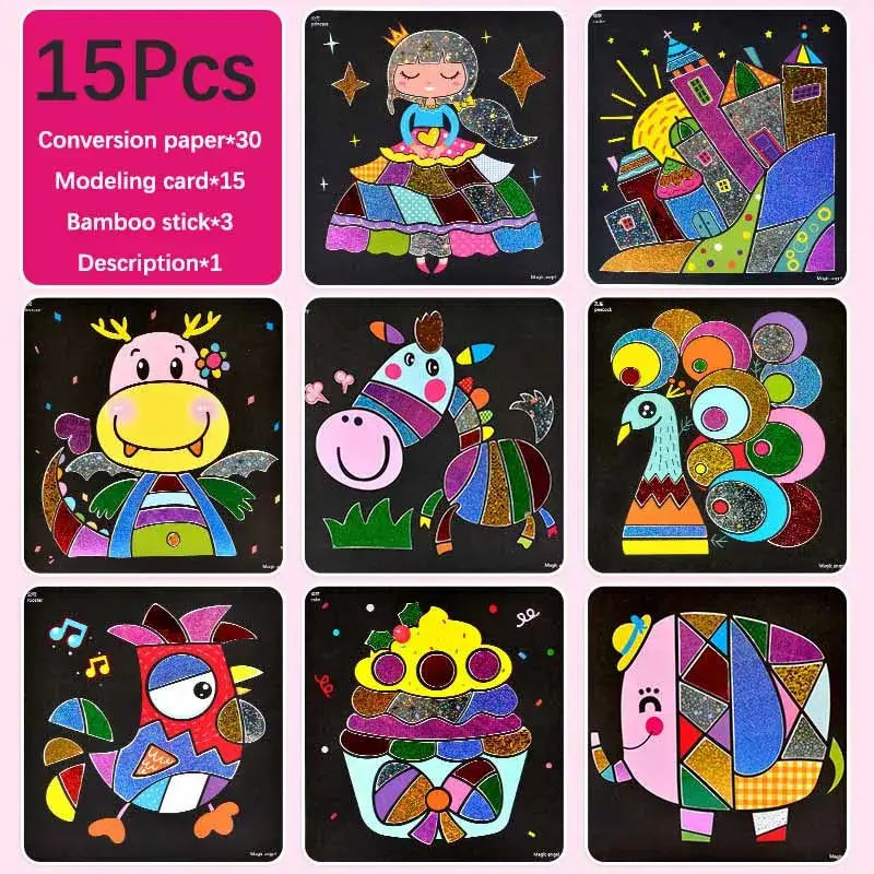 - Développement de compétences clés : La manipulation précise des autocollants et des paillettes favorise la dextérité manuelle et améliore la coordination œil-main, des compétences essentielles pour le développement global de l’enfant.