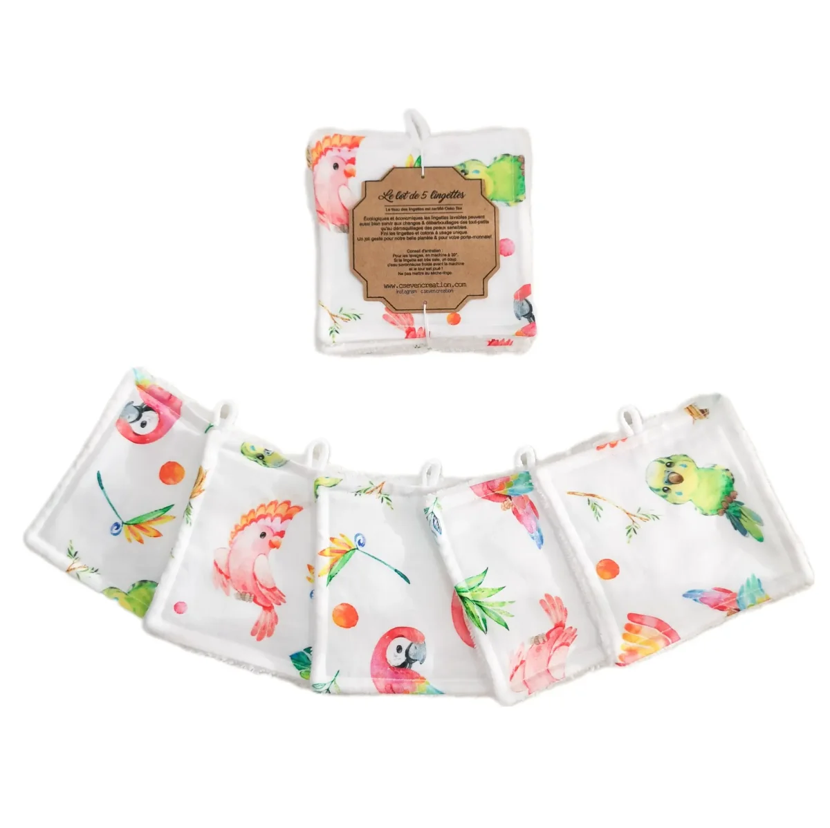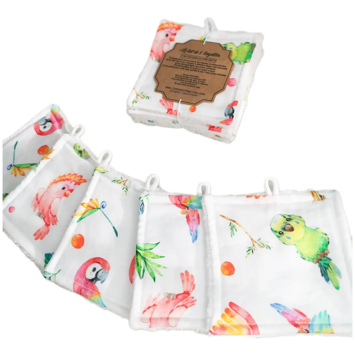 Le tissu éponge est certifié oeko-tex et le tissu perroquets est bio.