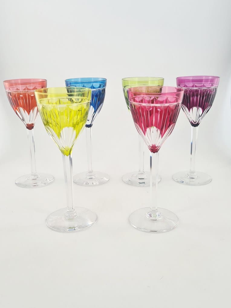 Magnifique série de 12 verres de couleurs en cristal doublé Val St Lambert.