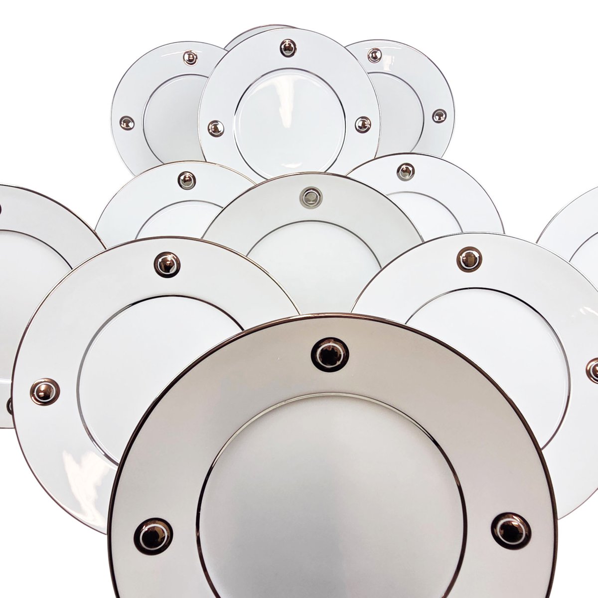 Magnifique suite de 12 assiettes de présentation en porcelaine de Limoges, maison Bernardaud, modèle Ithaque Platine