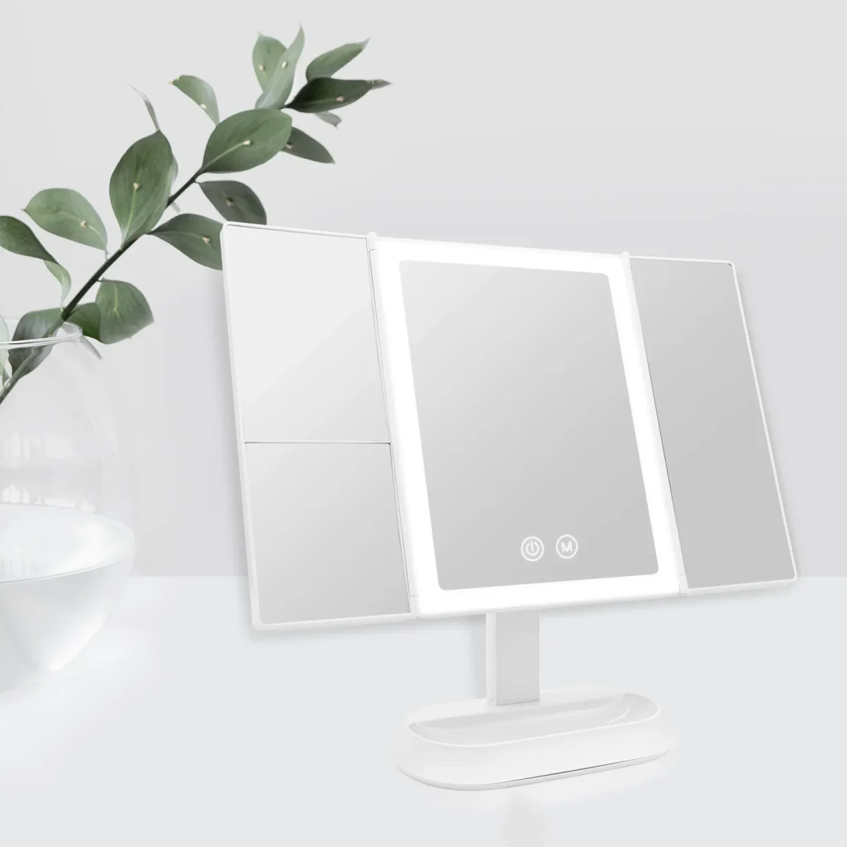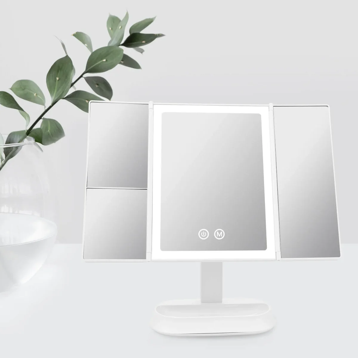 - 3 couleurs de lumière et luminosité réglable : Appuyez sur le bouton M en bas au centre du miroir pour changer la couleur de la lumière. (lumière blanche chaude, lumière naturelle, lumière blanche froide). Assurez-vous de pouvoir vous regarder clairement dans le miroir dans différentes conditions d’éclairage.
