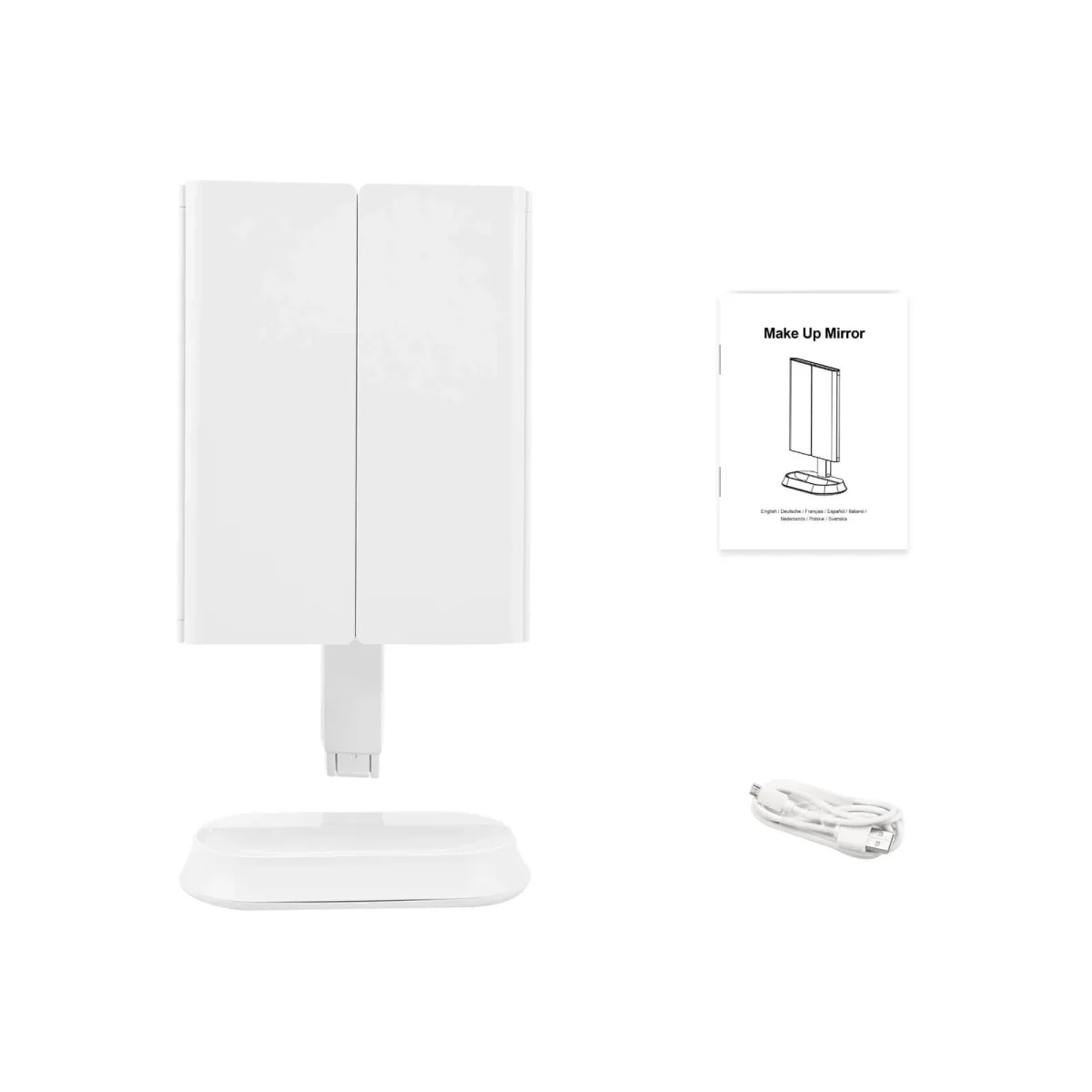 - 2 types d’alimentation : Vous pouvez choisir d’alimenter le miroir avec des piles (adaptées si vous avez le miroir avec vous) ou directement avec le câble USB (plus adapté à un usage domestique).