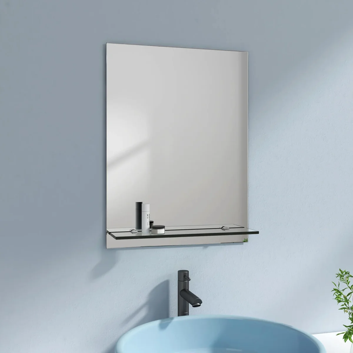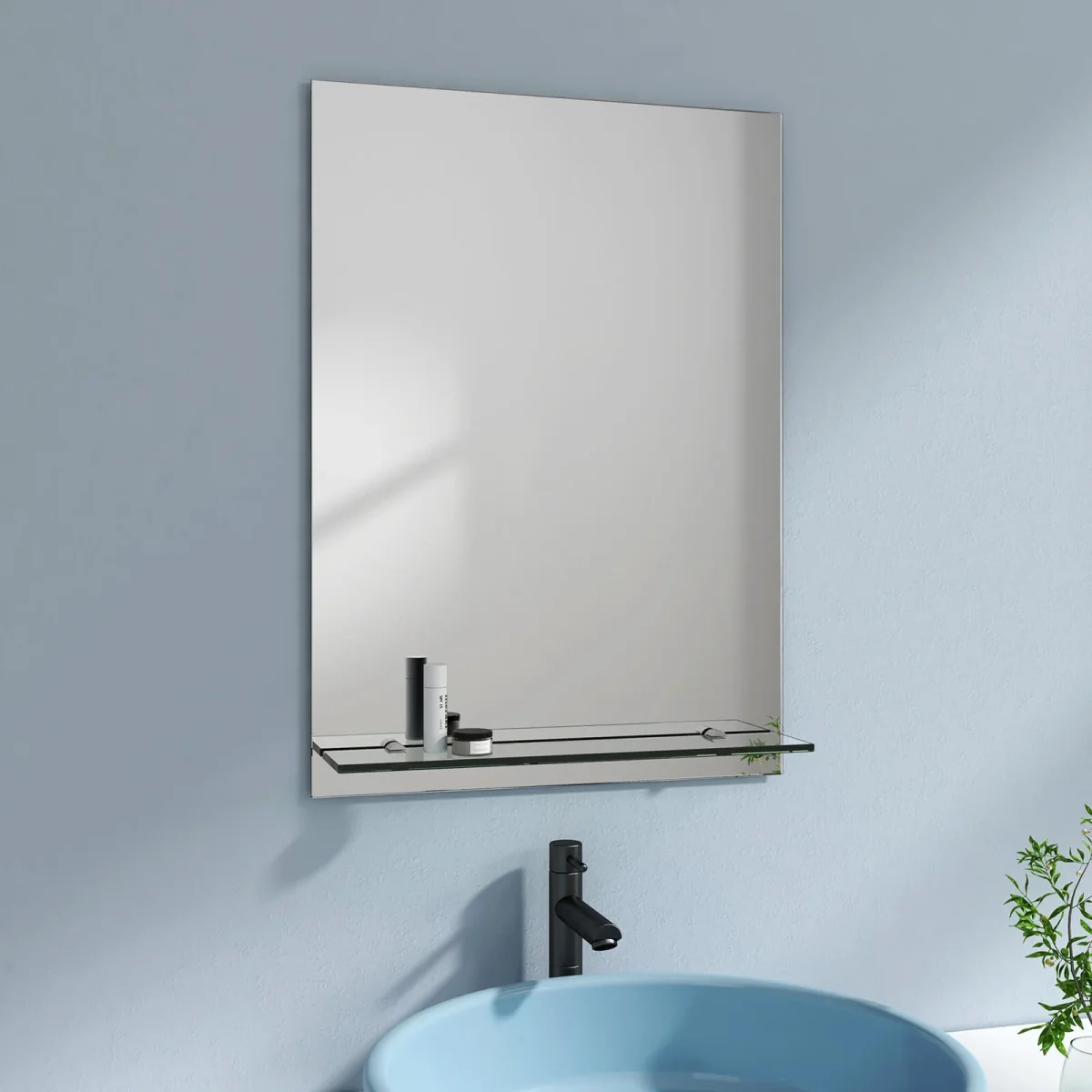 - Facile à installer : 1. Installez l’étagère sur le miroir. 2. Fixez le support mural au mur. 3. Accrochez le miroir au support.