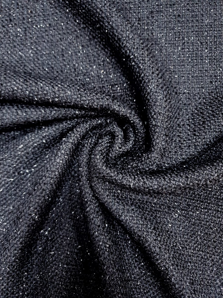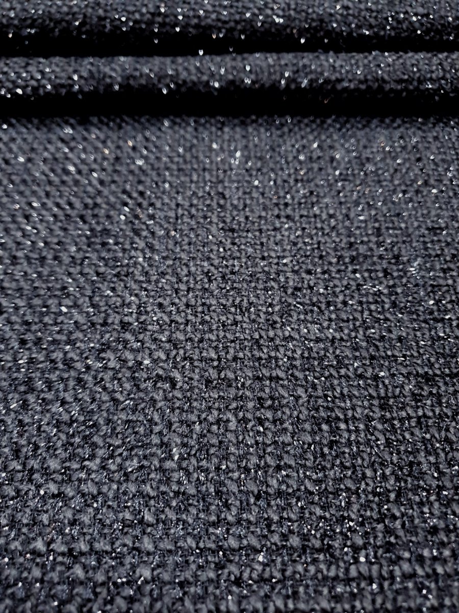 Natté noir incrusté de fils lurex . Matière souple, tissage lâche et irrégulier, très agréable à porter, il est cependant nécessaire de doubler pour donner un peu plus de corps au tissu. ( matière délicate )