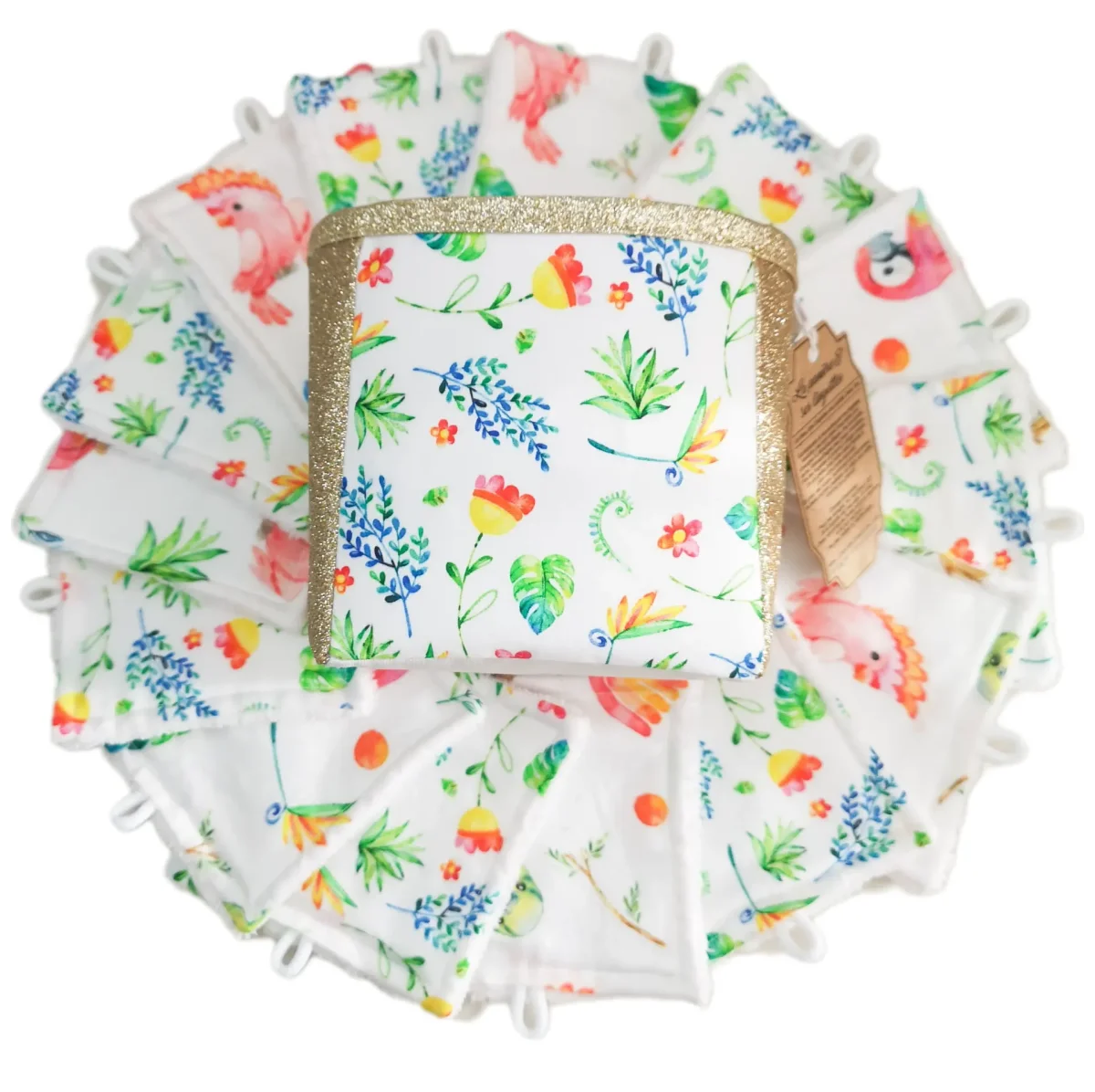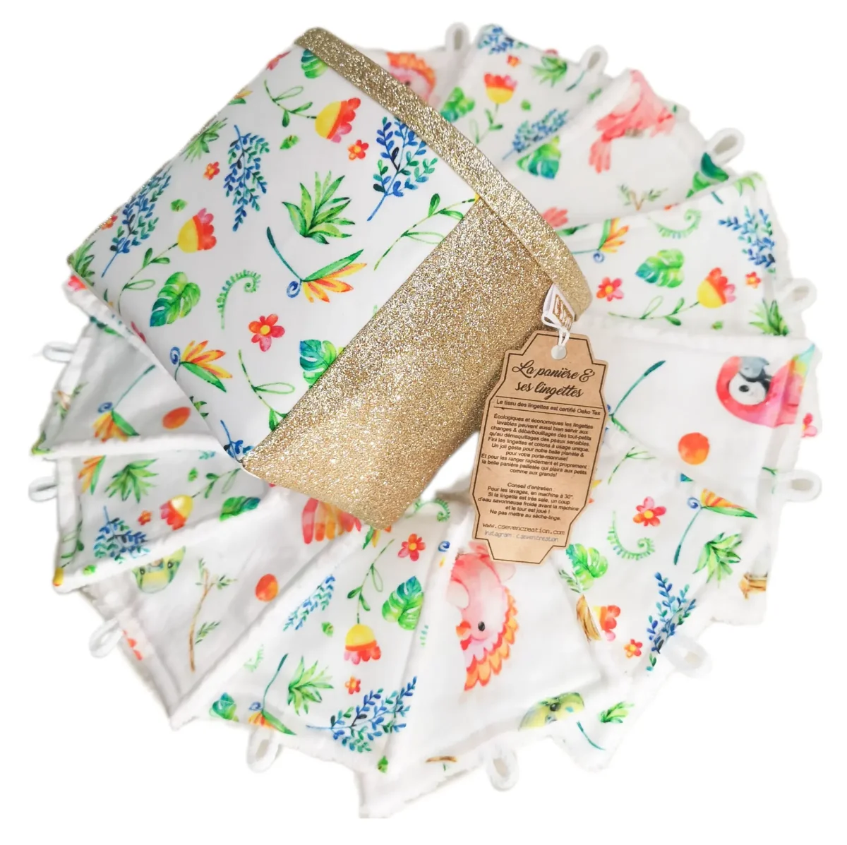 La panière comprend 8 lingettes motif flower pop & 7 lingettes motif perroquets.