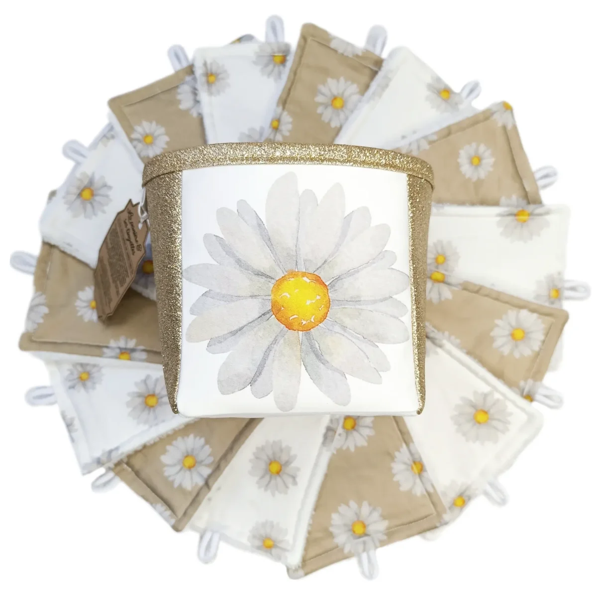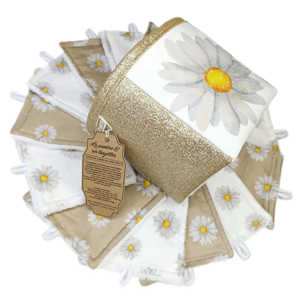 Lot de 15 lingettes lavables avec la panière assortie collection Marguerite Gold