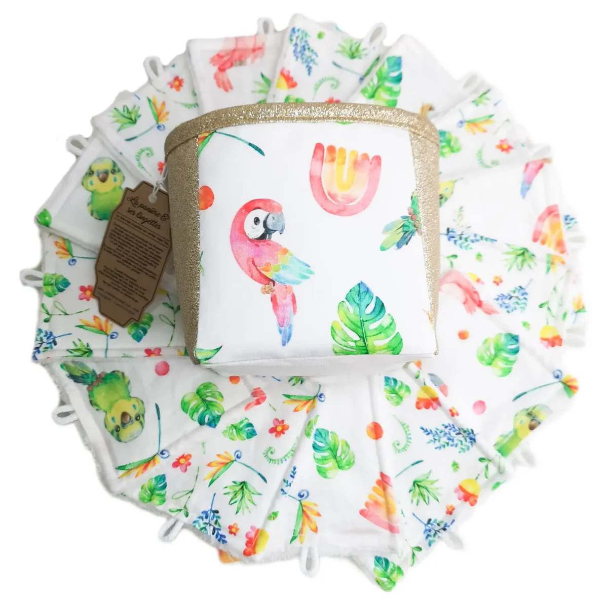 La panière comprend 8 lingettes motif perroquets & 7 lingettes motif flower pop.