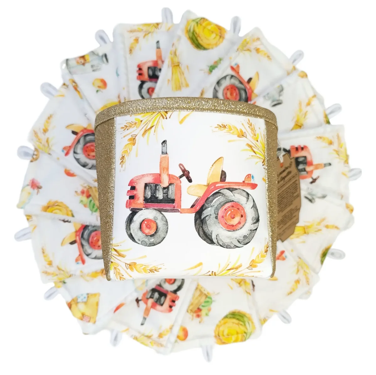 La panière comprend 8 lingettes motif tracteur & 7 lingettes motif ferme.