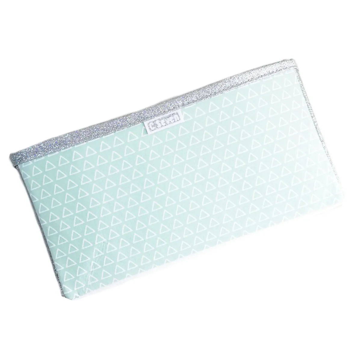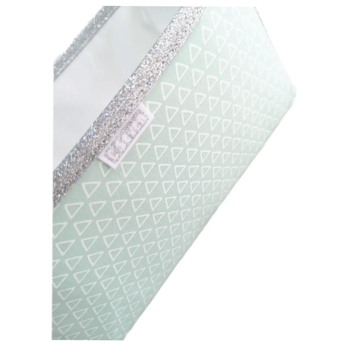 Elle est créé avec le tissu secondaire (triangles bleu) de la collection Panda Bleu et le même tissu pailleté (argenté) que la panière à lingettes.