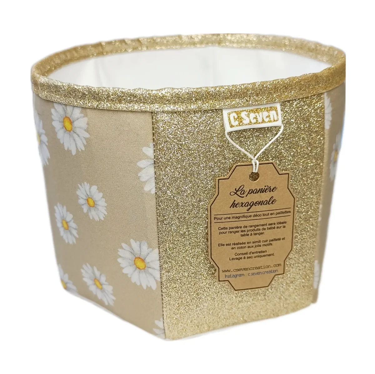 Elle est créé avec le tissu secondaire (Marguerite) de la collection Marguerite Gold et le même tissu pailleté (doré) que la panière à lingettes.