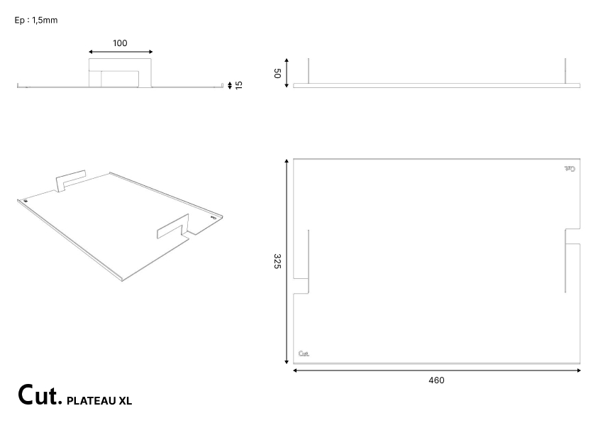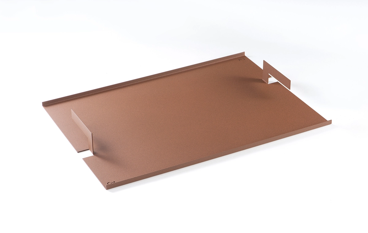 Plateau de service en acier, laqué au four. Comportant des poignées latérales. Livré en étui textile réutilisable.