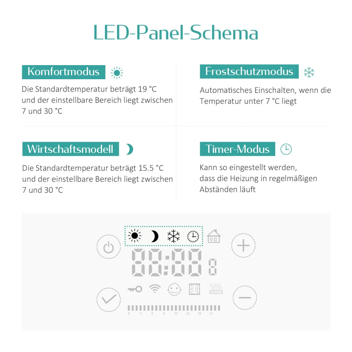 - Thermostat intelligent et numérique : Avec le thermostat intelligent, vous pouvez réguler la température de votre pièce entre 7 degrés et 30 degrés. Le panneau de commande numérique rend l’opération rapide et facile.