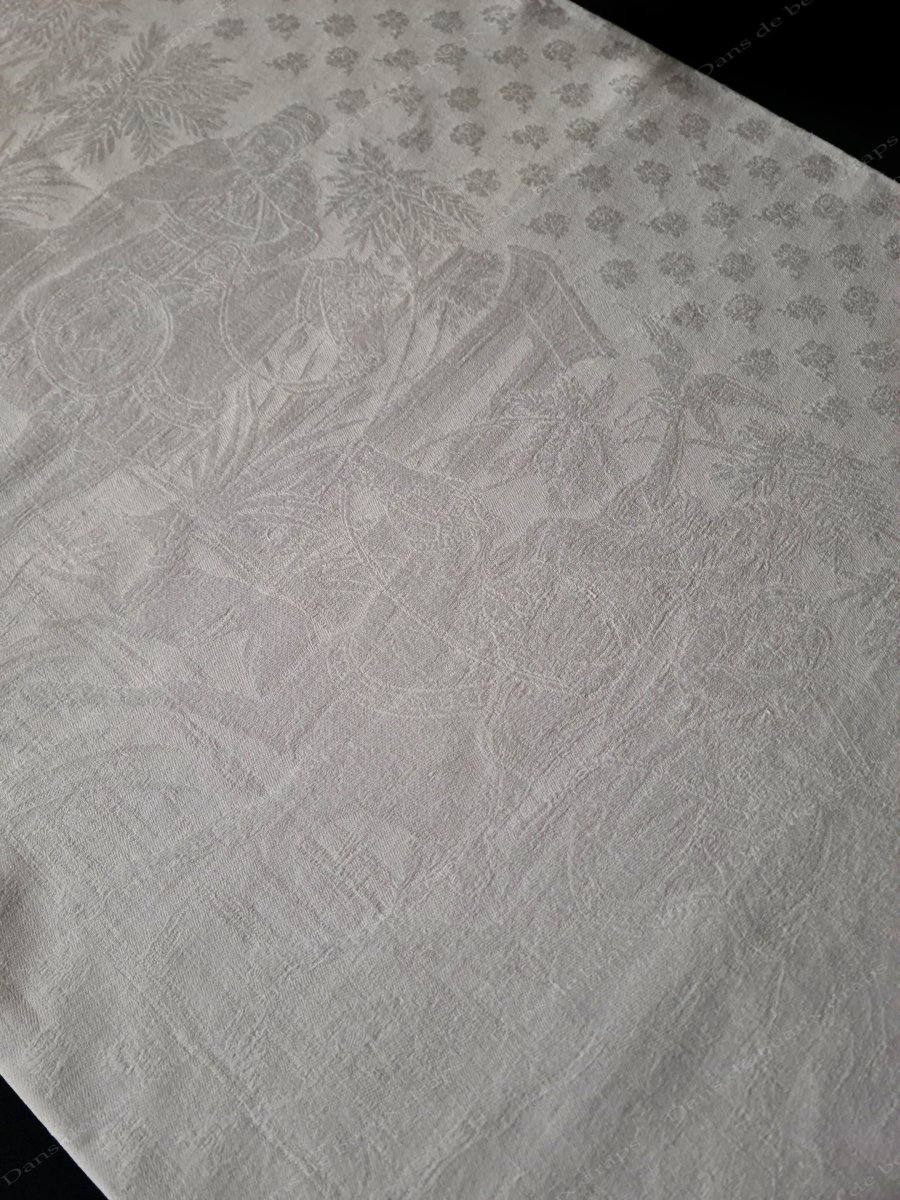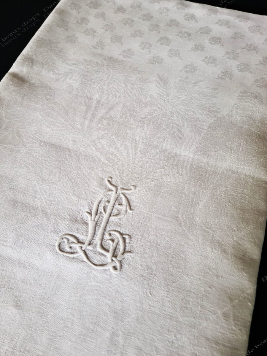 Rare nappe en damassé de lin à décor de chasse dans le désert,monogramme LL.