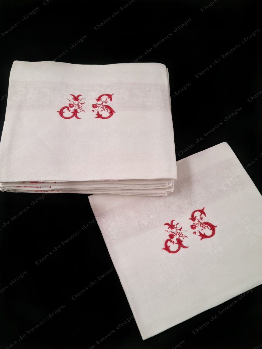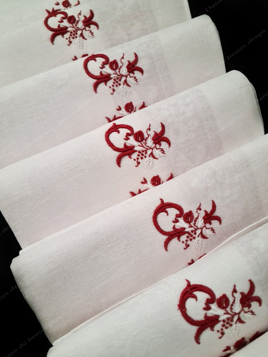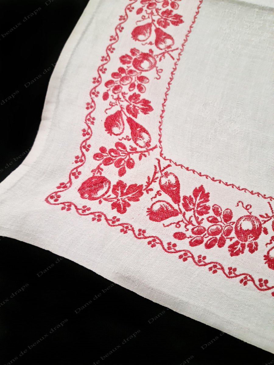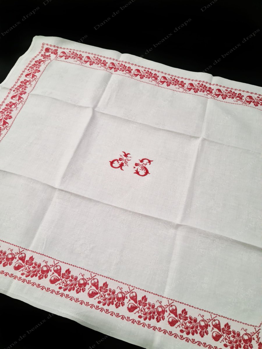 Au centre, extraordinaire monogramme JS ,brodé main en relief de couleur rouge vif et blanc entrelacé dans une grappe de fruits.