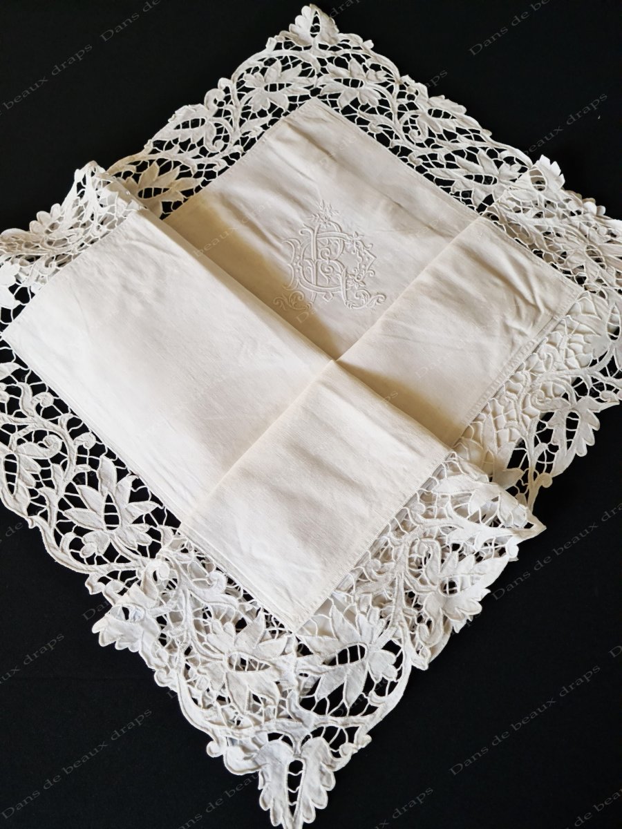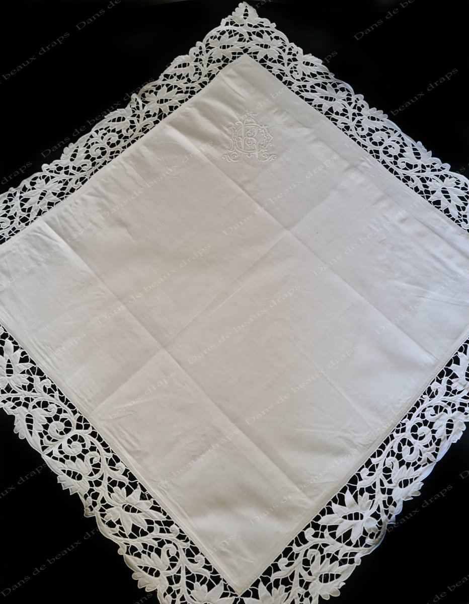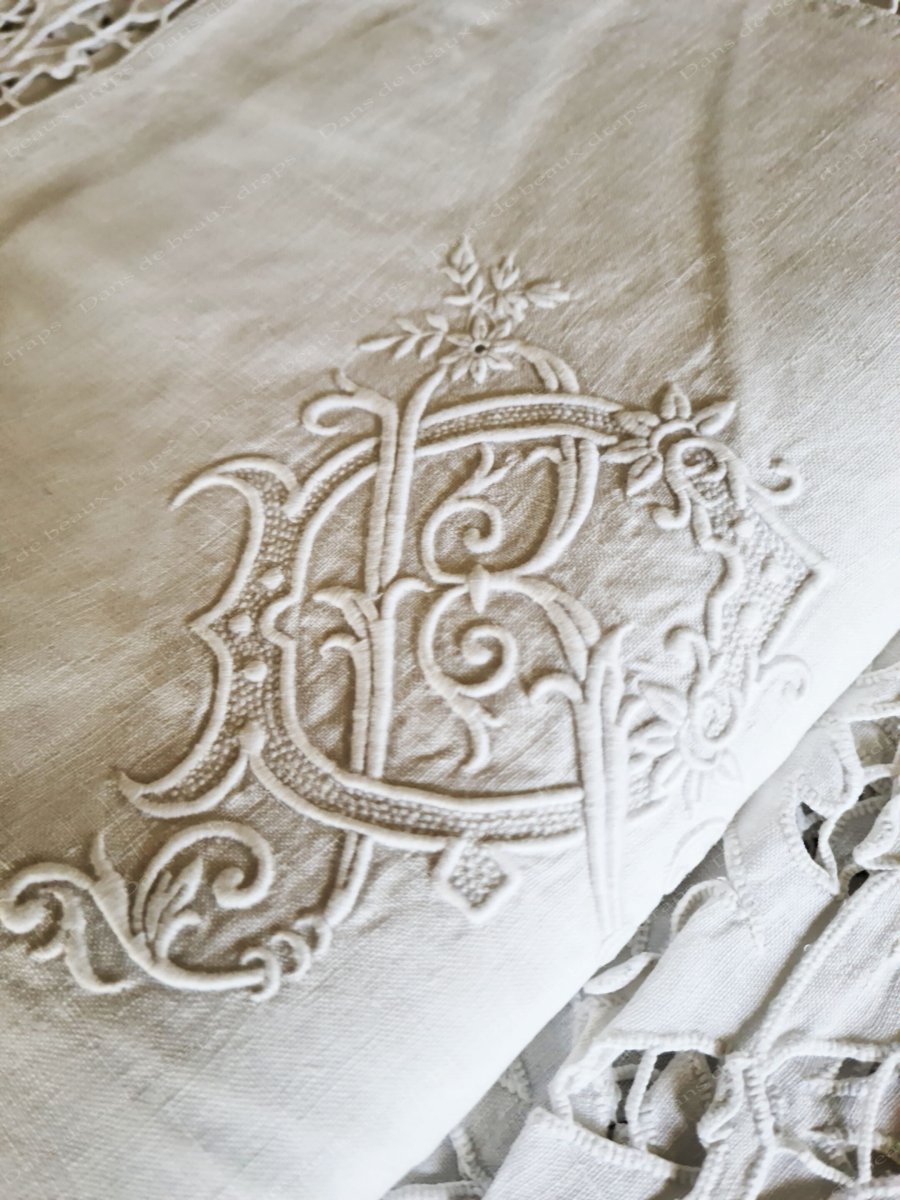 Dans un angle,un magnifique monogramme DR,brodé main au point de bourdon et de sable,entrelacé de fleurs.