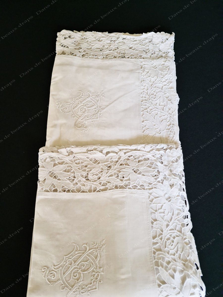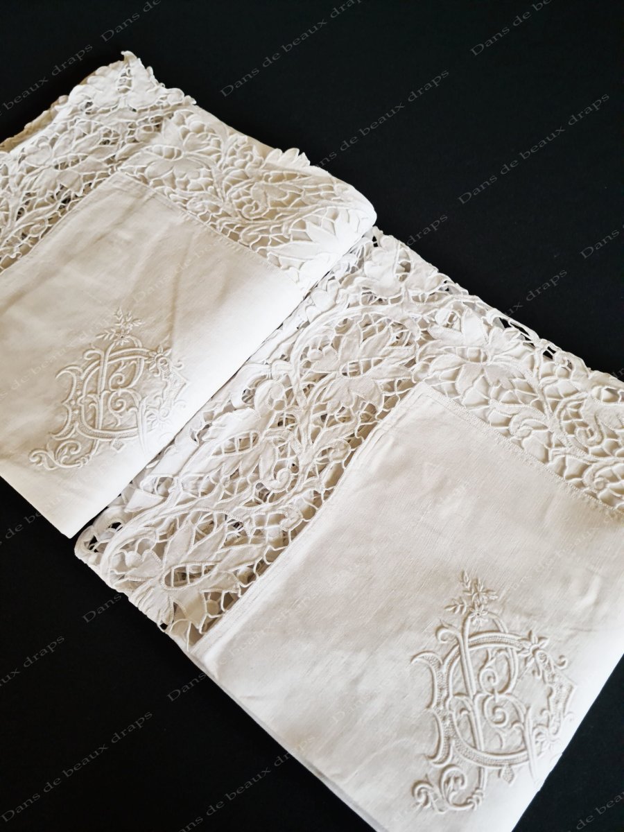 Ravissante paire de taies d’oreiller en fil de lin monogramme DR,broderies Richelieu.