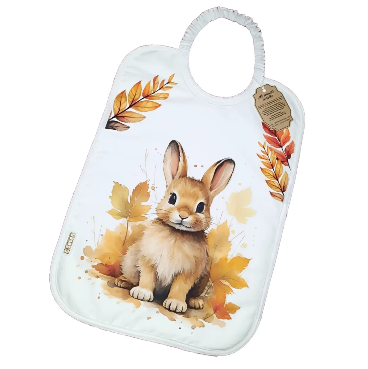 La serviette est constituée d’une première couche en coton bio, d’une seconde couche de tissu étanche (oeko-tex) et d’une dernière couche en éponge toute douce (oeko-tex). Elle mesure 39cm de haut (sans compter la longueur d’élastique) et 28cm de large afin de couvrir entièrement le buste ainsi que les épaules de l’enfant.