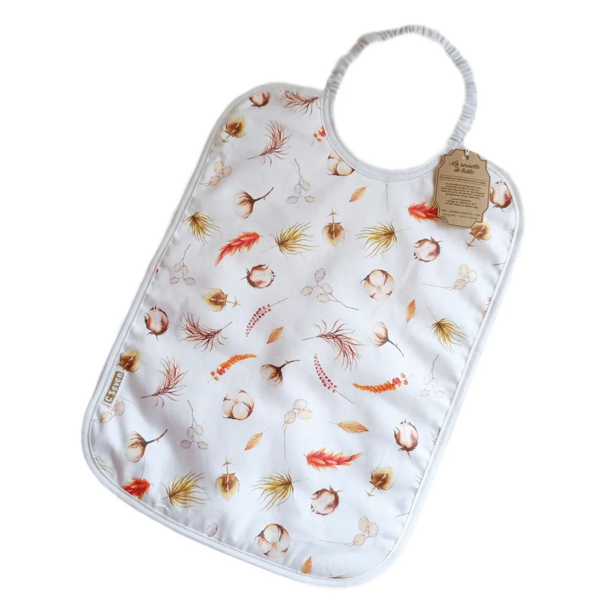 La serviette est constituée d’une première couche en coton bio, d’une seconde couche de tissu étanche (oeko-tex) et d’une dernière couche en éponge toute douce (oeko-tex). Elle mesure 39cm de haut (sans compter la longueur d’élastique) et 28cm de large afin de couvrir entièrement le buste ainsi que les épaules de l’enfant.