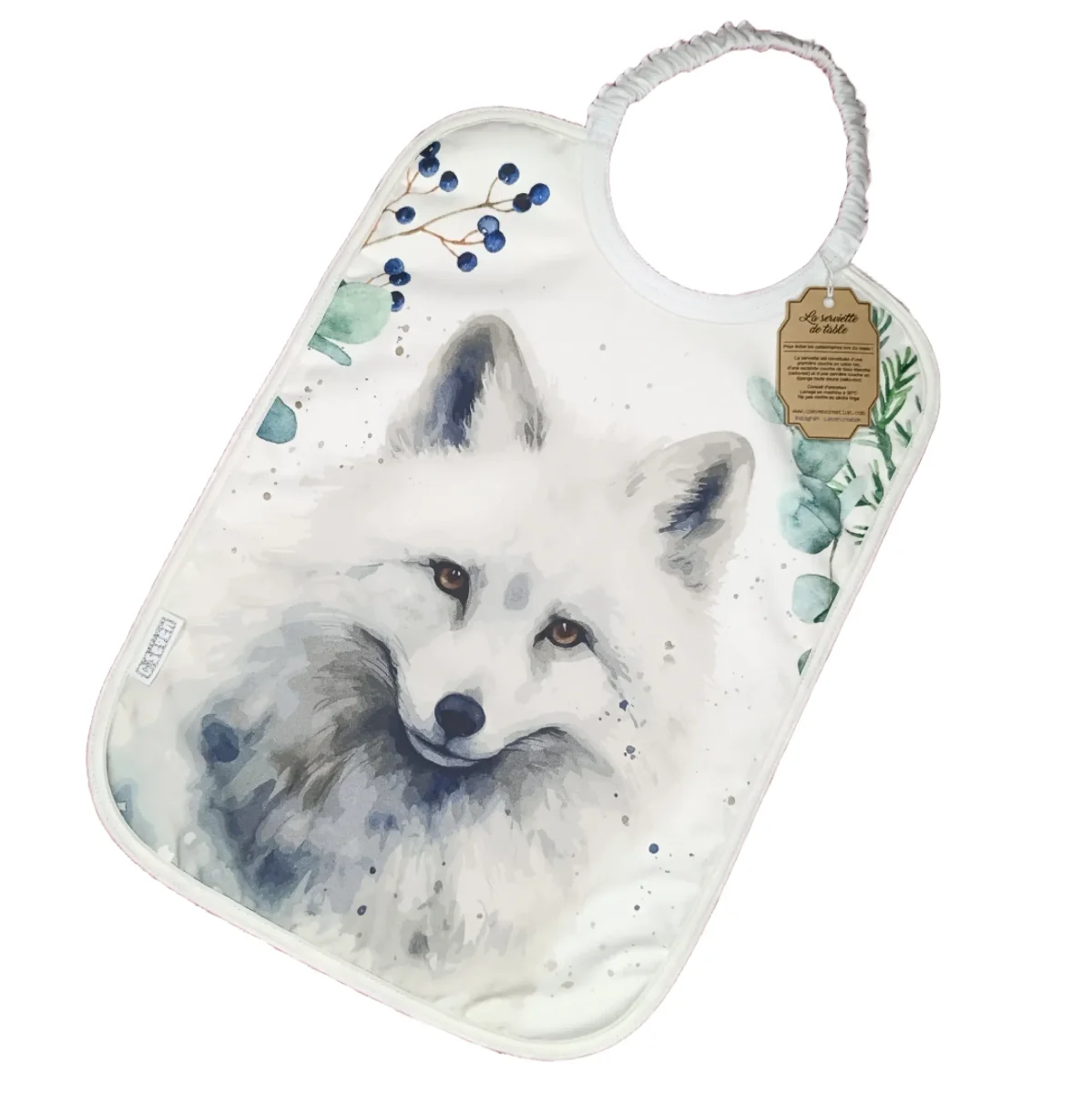 La serviette est constituée d’une première couche en coton bio, d’une seconde couche de tissu étanche (oeko-tex) et d’une dernière couche en éponge toute douce (oeko-tex). Elle mesure 39cm de haut (sans compter la longueur d’élastique) et 28cm de large afin de couvrir entièrement le buste ainsi que les épaules de l’enfant.