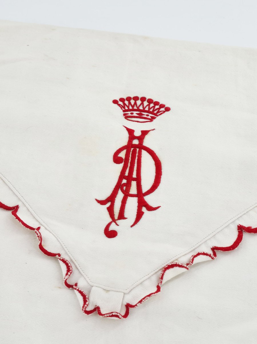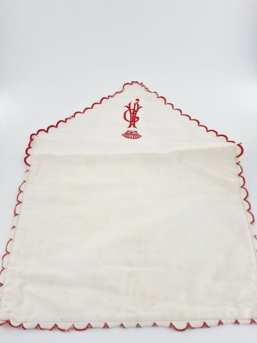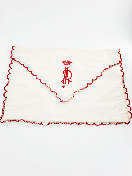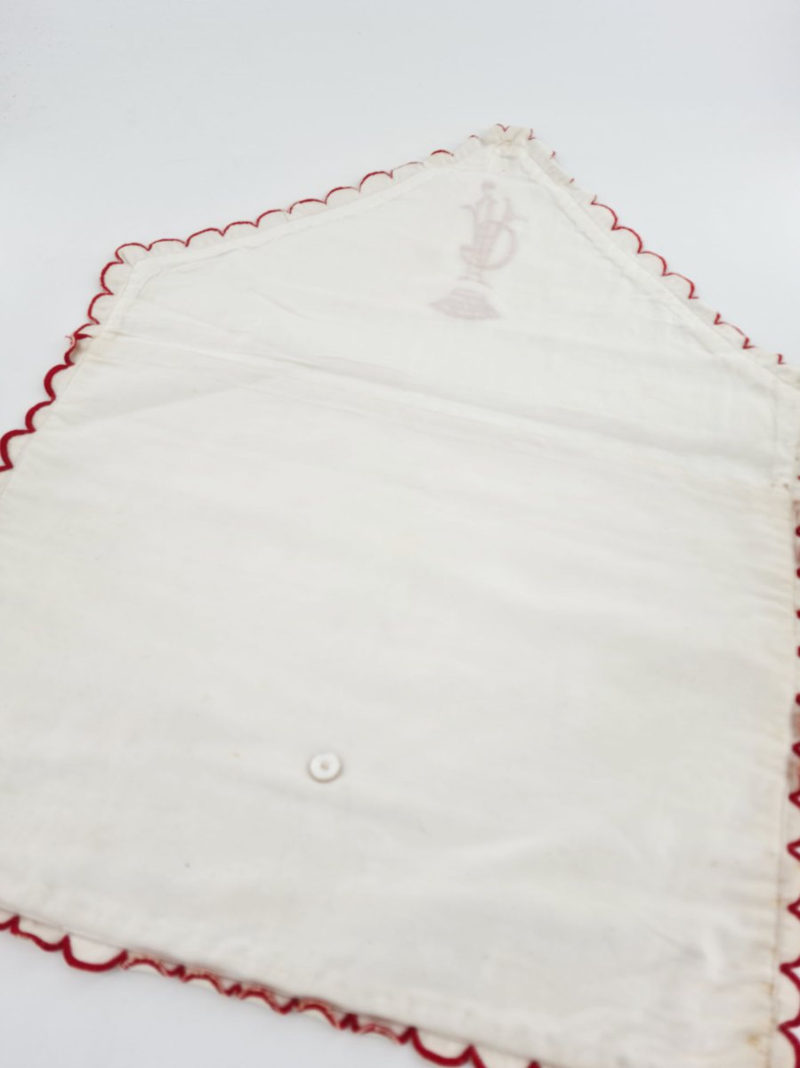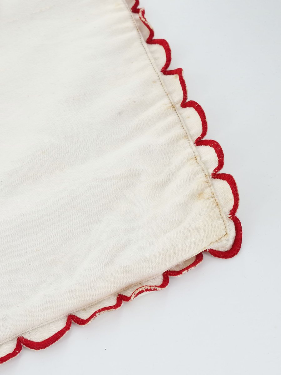 Blanche, elle est pourvue d’un entourage festonné brodé rouge au point de bourdon.