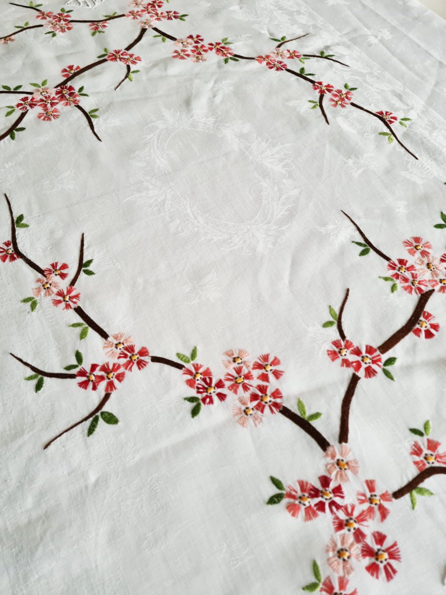 Un service de table ravissant grâce aux couleurs et à la légèreté des broderies,joli décor et belle qualité du damassé.