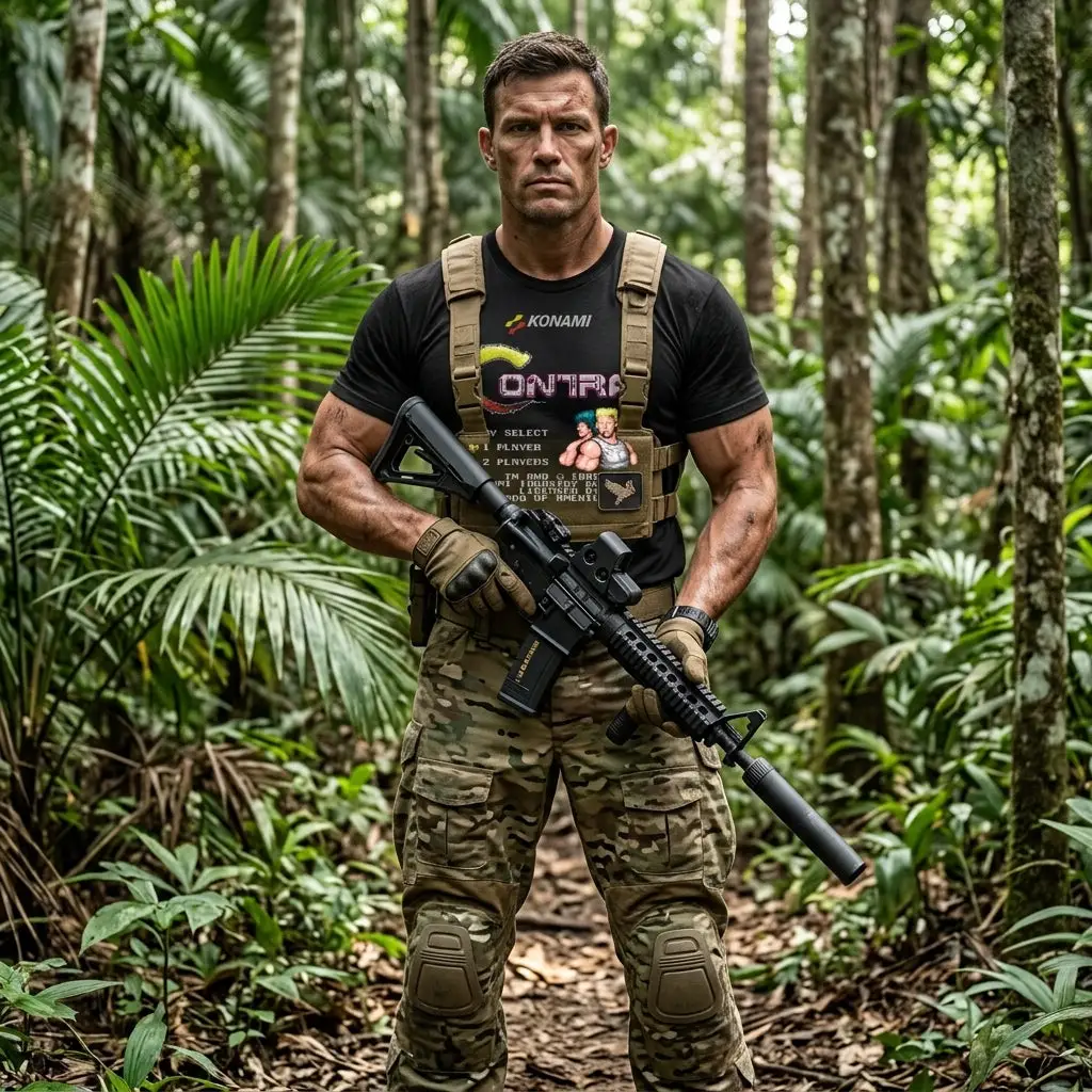 Design rétro iconique : visuel inspiré de l’écran de sélection du jeu Contra.
