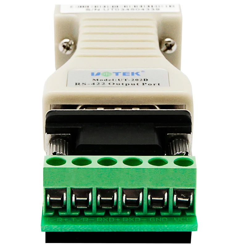 Le UT-202 est équipé de connecteurs DB9 standards pour assurer une compatibilité maximale avec les équipements existants. Il dispose d’un connecteur DB9 femelle pour l’entrée RS-232 et d’un connecteur DB9 mâle pour la sortie RS422. Cette configuration de connecteurs facilite l’installation du convertisseur dans des systèmes variés et permet des connexions rapides et sécurisées. De plus, le convertisseur est compatible avec les câbles en paire torsadée (twisted pair) ou les câbles STP (Shielded Twisted Pair), ce qui permet une flexibilité dans le choix des supports de transmission.